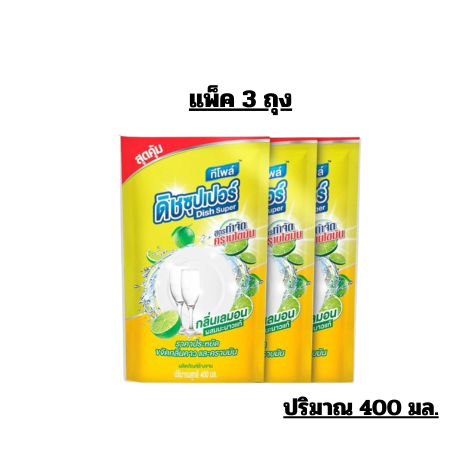 ทีโพล์ ดิช ซุปเปอร์ กลิ่นเลมอน ผลิตภัณฑ์ล้างจานปริมาณ 400 มล.//แพ็ค 3 ถุง//