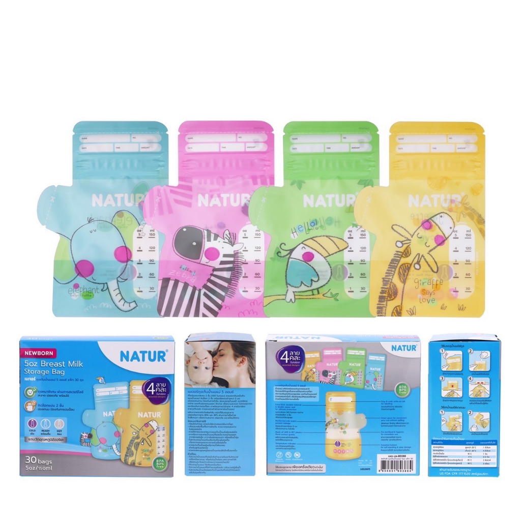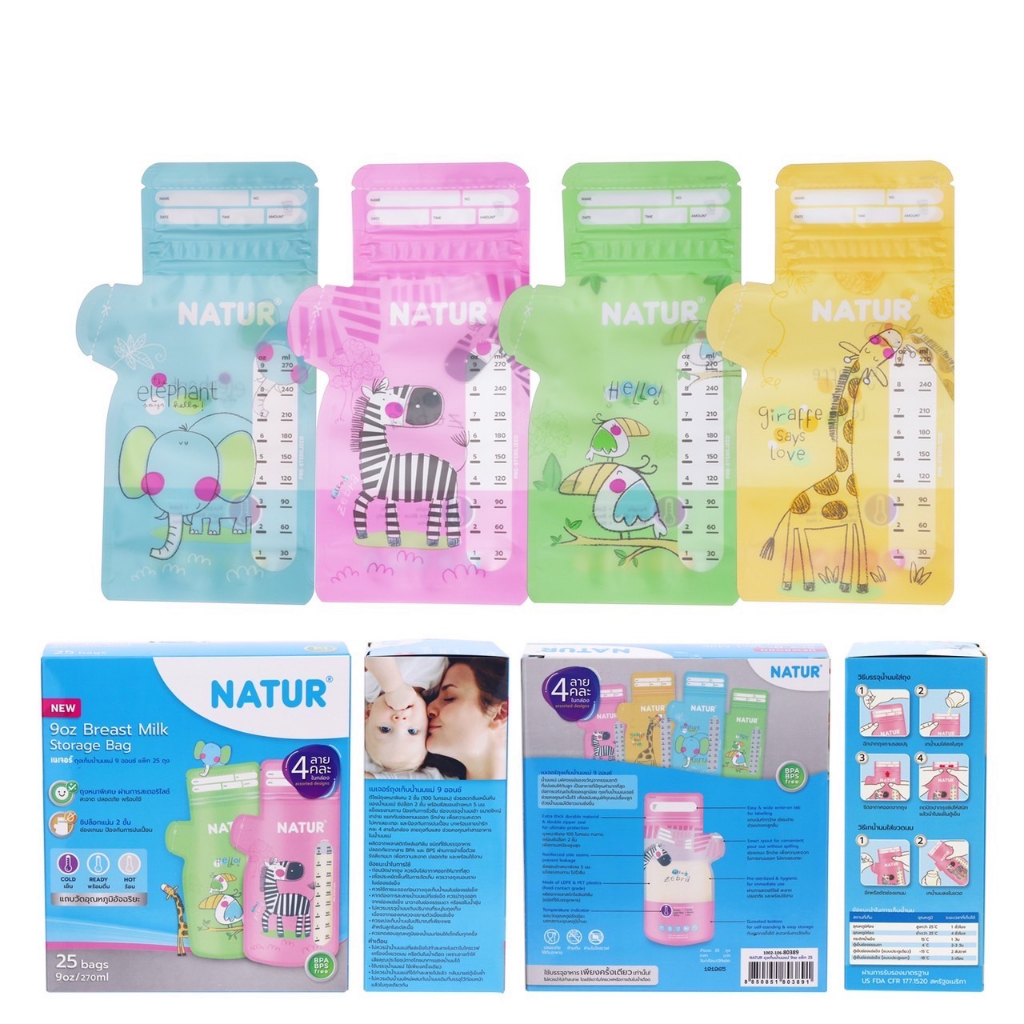 Natur เนเจอร์ ถุงเก็บน้ำนมแม่ มี 4 ลาย คลนะในกล่อง 5 oz 30 ถุง / 9 oz 25 ถุง