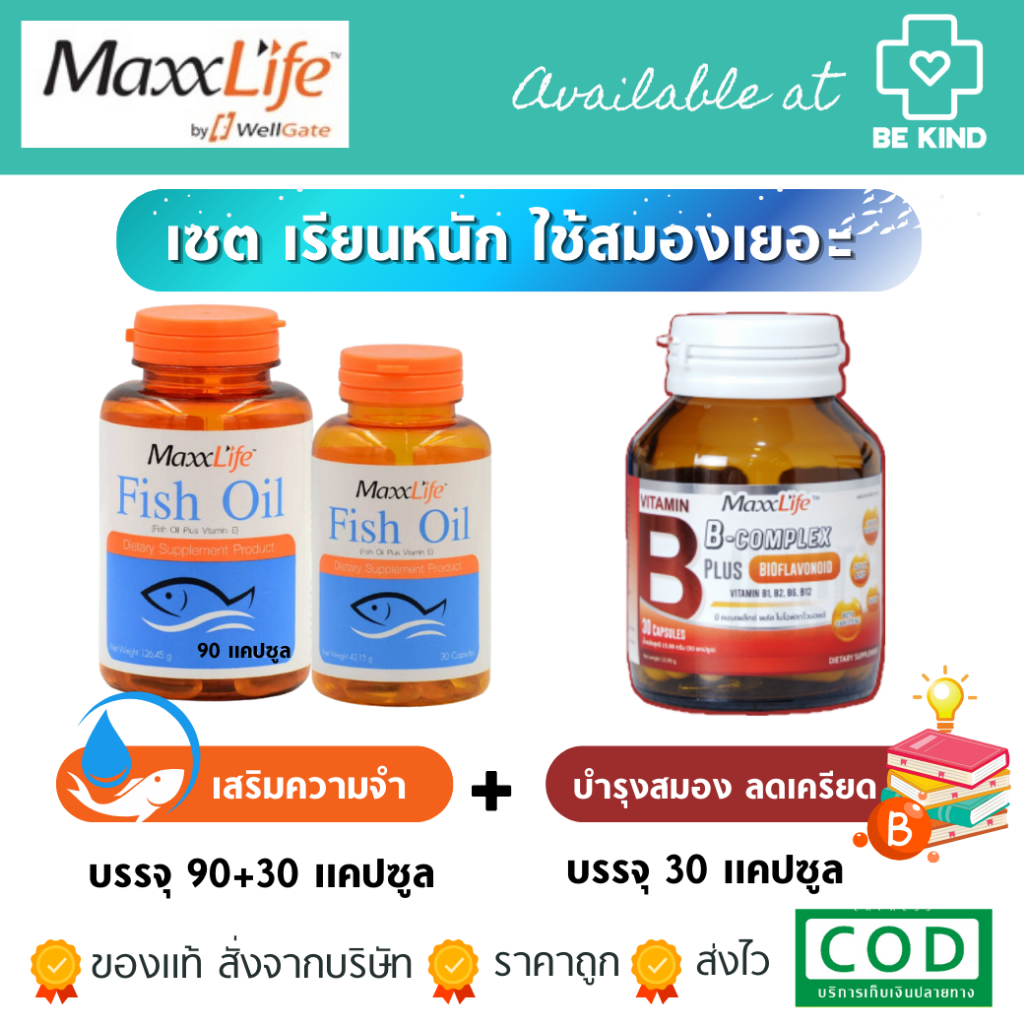 Maxxlife เซต เรียนหนัก ใช้สมองเยอะ [ Fish Oil 90's Free 30's.+ (B-COMPLEX) ]