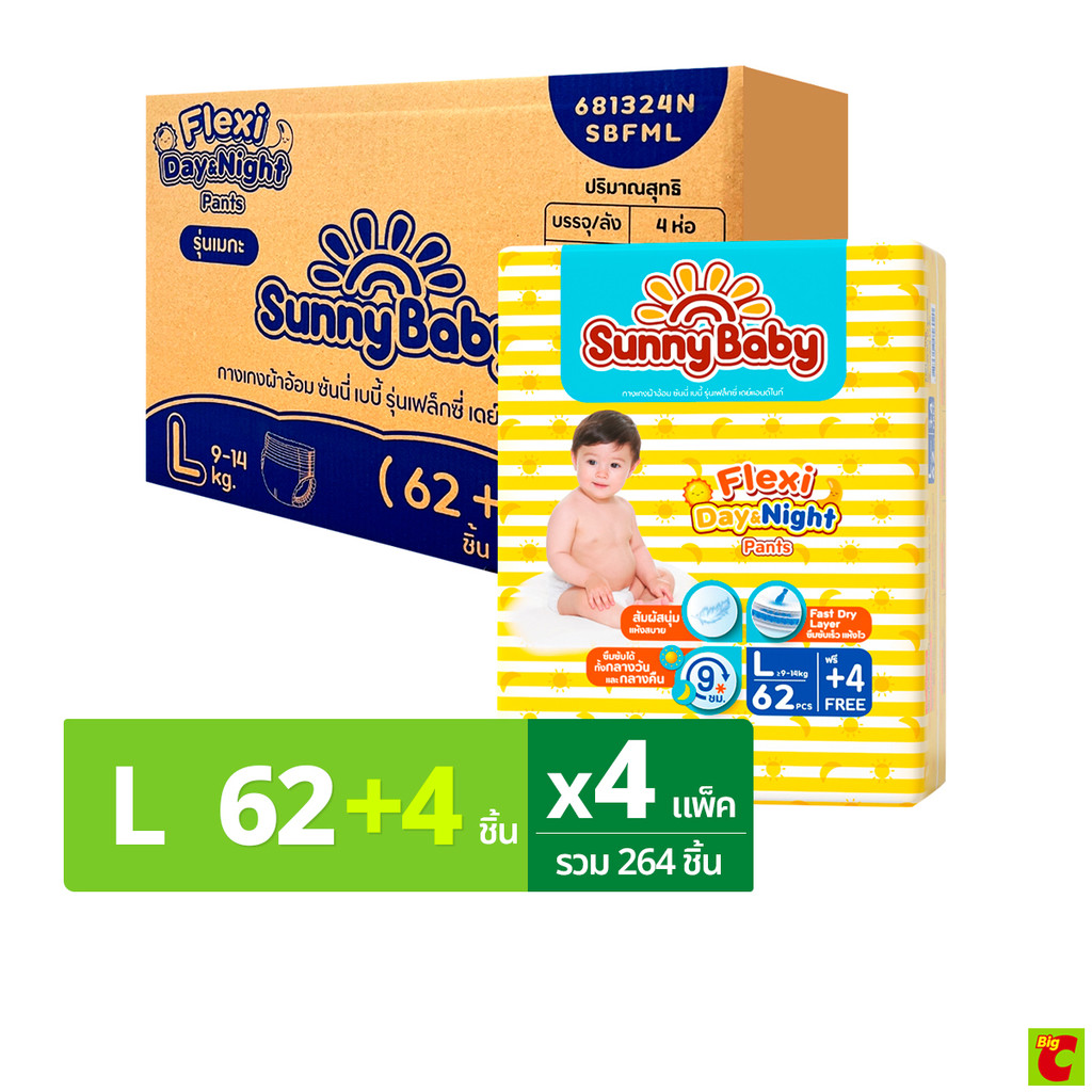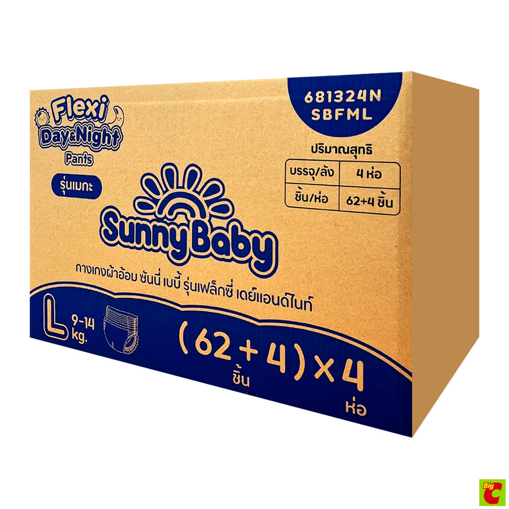 ซันนี่ เบบี้ เฟล็กซี่ เดย์แอนด์ไนท์ แพ้นท์ กางเกงผ้าอ้อม ขนาด L 62+4 ชิ้น x 4 ห่อ