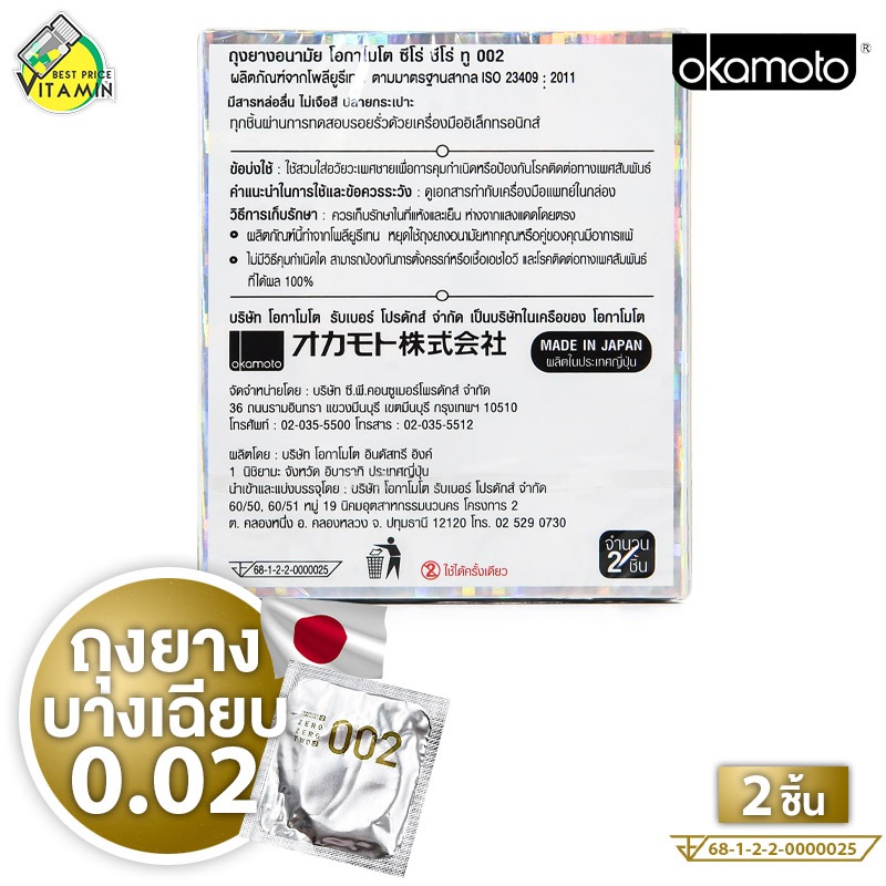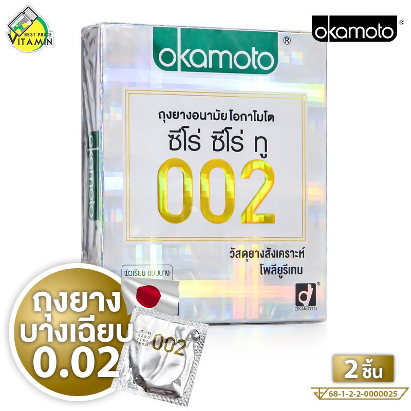 Okamoto 002 โอกาโมโต ซีโร่ ซีโร่ ทู [2 ชิ้น] ถุงยางอนามัย ถุงยางเรียบ ถุงยาง52ผิวเรียบ แบบบาง [ไม่ระบุชื่อสินค้าหน้ากล่อ