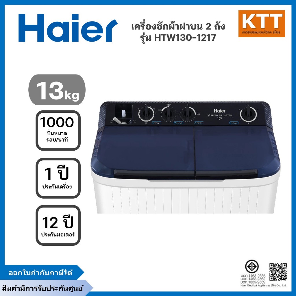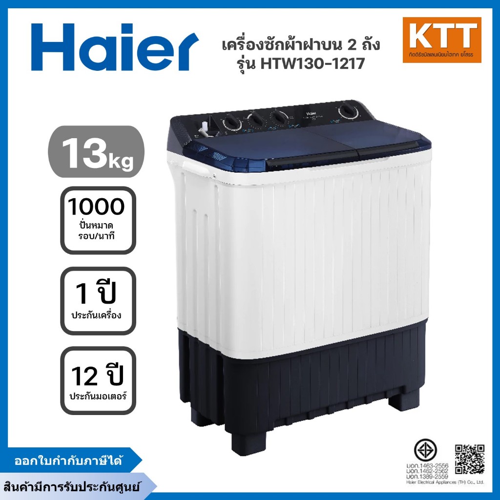 Haier เครื่องซักผ้า 2 ถัง กึ่งอัตโนมัติ ความจุ 13 kg รุ่น HTW130-1217