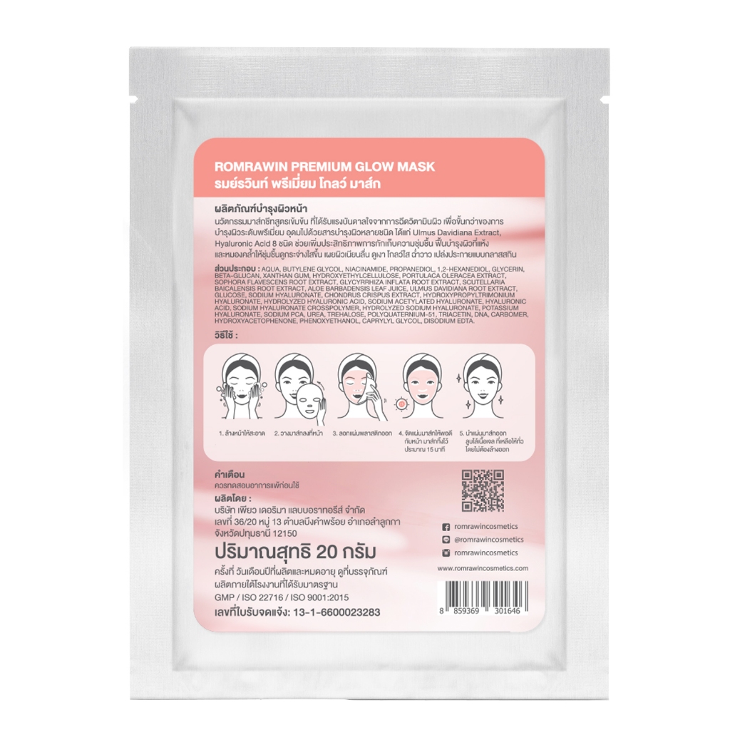 Romrawin Premium Glow Mask 20 g. มาสก์บำรุงผิวหน้า 1 แผ่น (มาส์กหน้า, Sheet Mask)