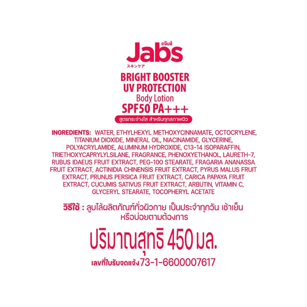 (แพ็คคู่) Jabs กันแดด แจ๊บส์ ไบรท์บูสเตอร์ ยูวี โพรเทคชั่น บอดี้โลชั่น SPF50 PA+++ 450มล. x2