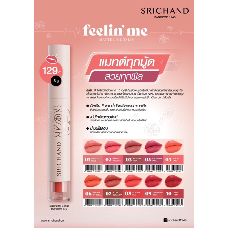 SRICHAND Feelin’ Me Matte Liquid Lip 3g. ศรีจันทร์ ลิปลิควิดเนื้อแมท เกลี่ยง่าย สีชัด เม็ดสีแน่น ติดทน ลิปแมท