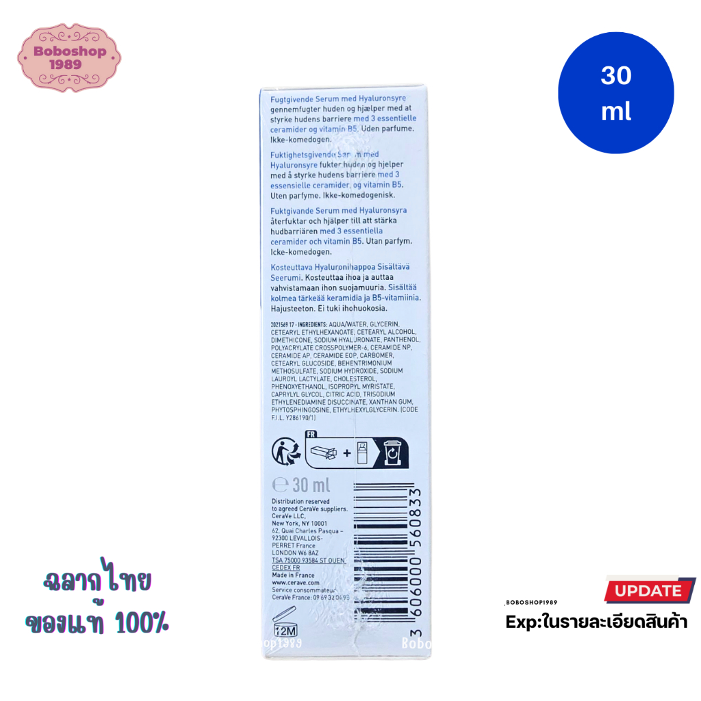 เซราวี CERAVE HYDRATING HYALURONIC ACID SERUM เซรั่มบำรุงผิวหน้า เพื่อผิวนุ่มชุ่มชื้น เนื้อบางเบา 30ml.