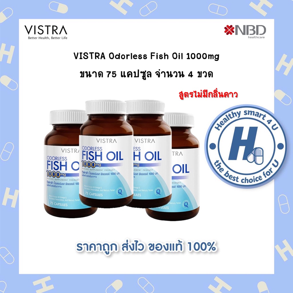📌 ซื้อ 4 คุ้มกว่า 📌 Vistra Odorless Fish Oil 1000mg (น้ำมันปลาสูตรไม่มีกลิ่นคาว) 75 แคปซูล จำนวน 4 ขวด