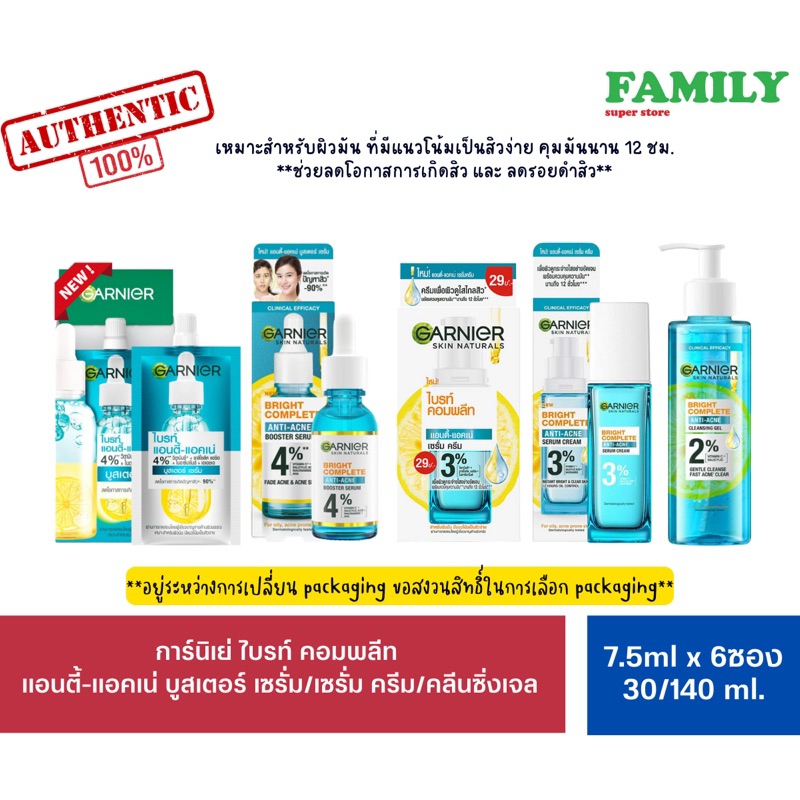 GARNIER การ์นิเย่ ไบรท์ คอมพลีท แอนตี้-แอคเน่ บูสเตอร์ เซรั่ม/เซรั่ม ครีม/คลีนซิ่งเจล [001][002]