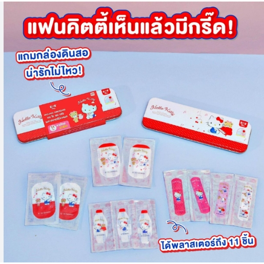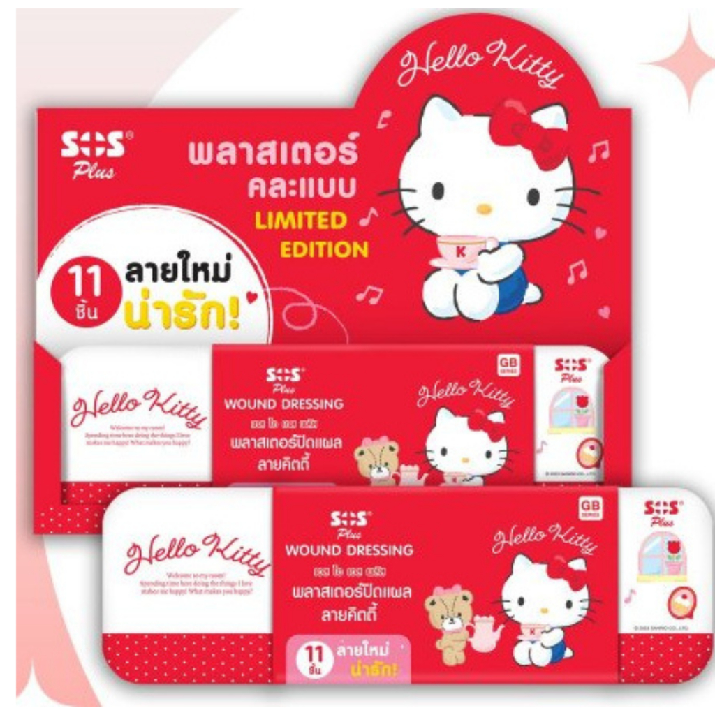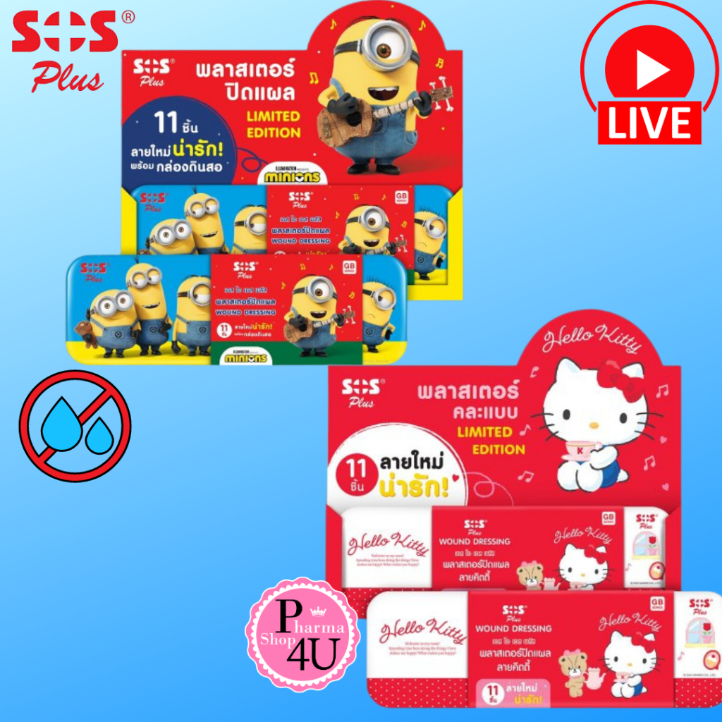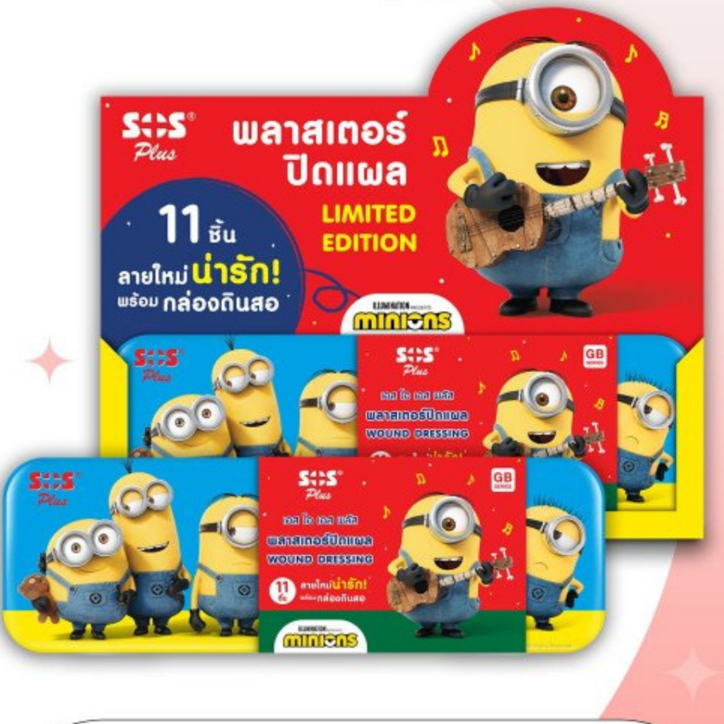 SOS Plus พลาสเตอร์ปิดแผล คละแบบ 11 ชิ้น แถมกล่องดินสอ ลายคิตตี้ มินเนี่ยน #L1
