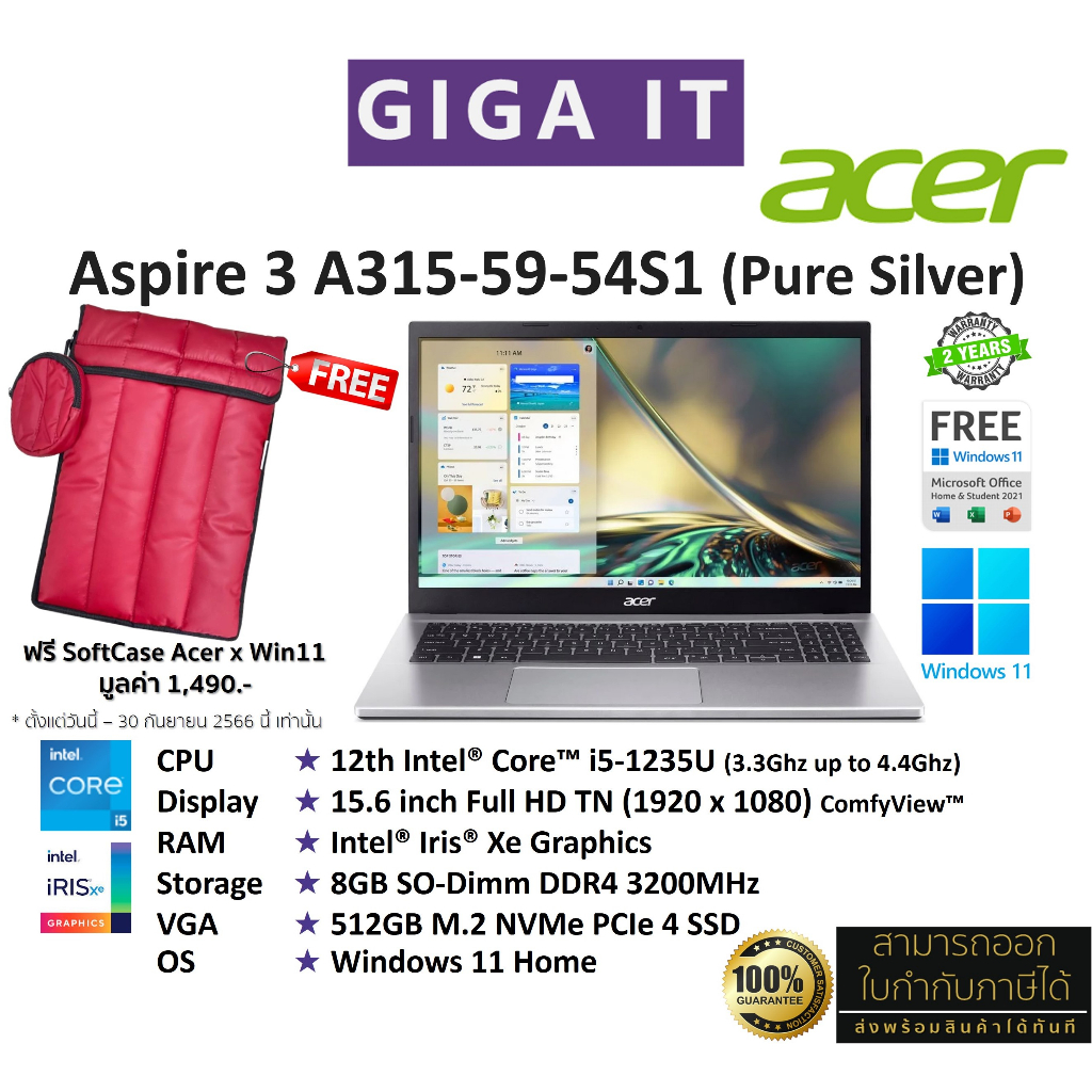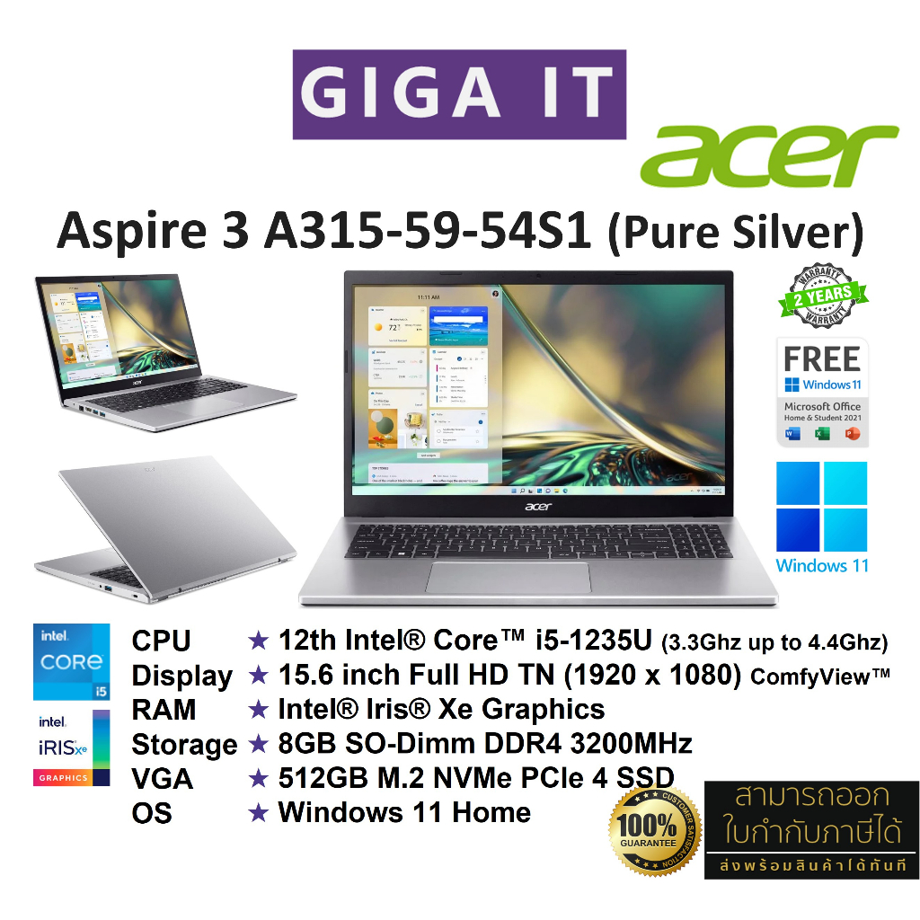 Acer Aspire 3 A315-59-54S1 (15.6" FHD,i5-1235U, 8GB,Iris® Xe, 512GฺB M.2, Win11 + Office) Pure Silver ประกันศูนย์ 2 ปี