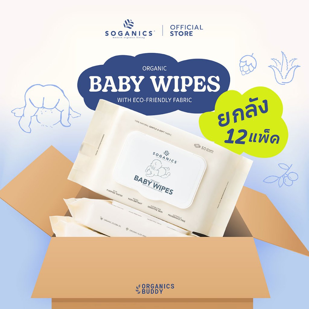 [ยกลัง 12 แพ็ค] SOGANICS Organic Baby Wipes (50 Sheets) ทิชชู่เปียก ผ้านุ่มละมุนจากใยธรรมชาติ100%