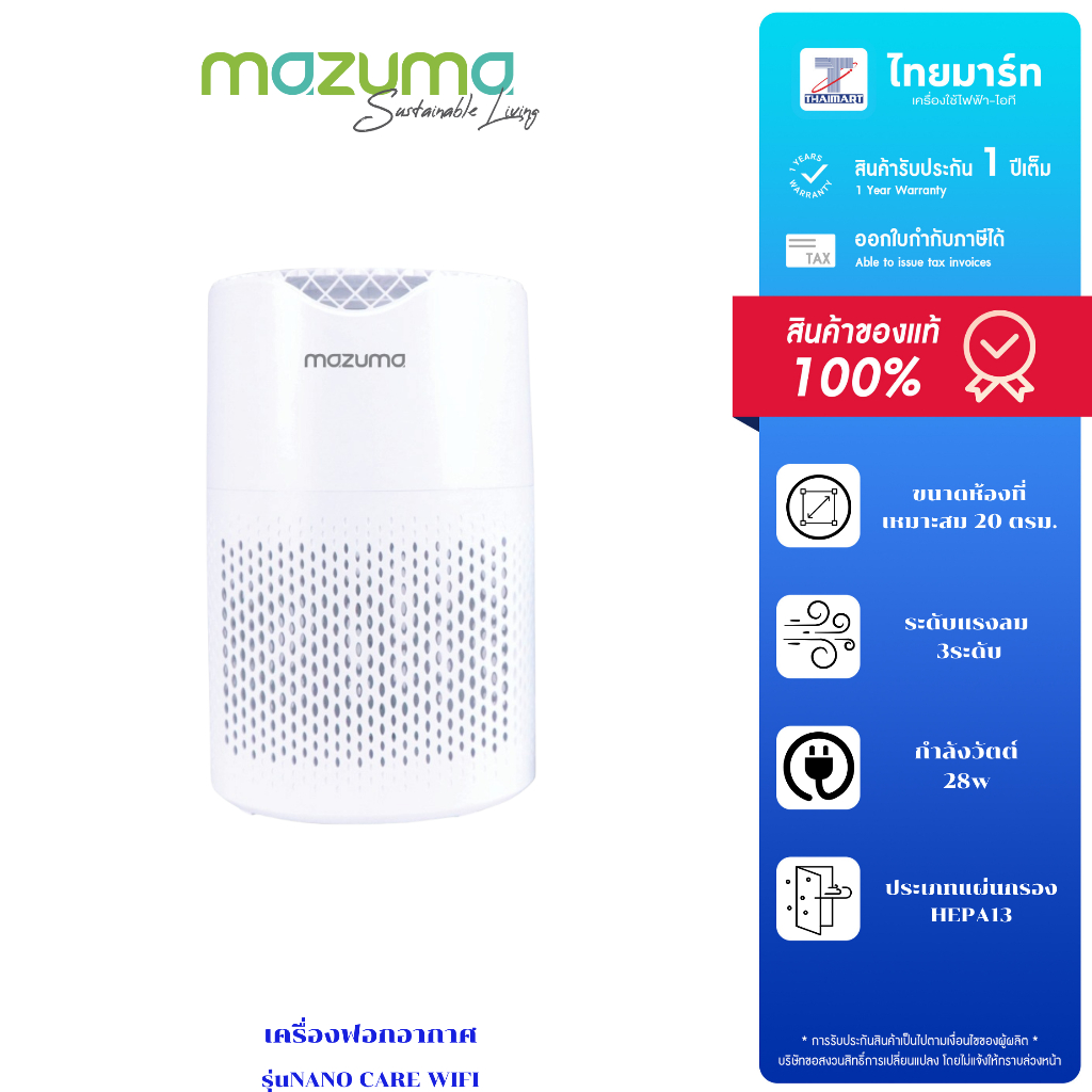 MAZUMA เครื่องฟอกอากาศ รุ่น NANO CARE WiFi เหมาะสำหรับห้องที่มีพื้นที่ขนาด 20 ตร.ม. รับประกัน 1 ปี