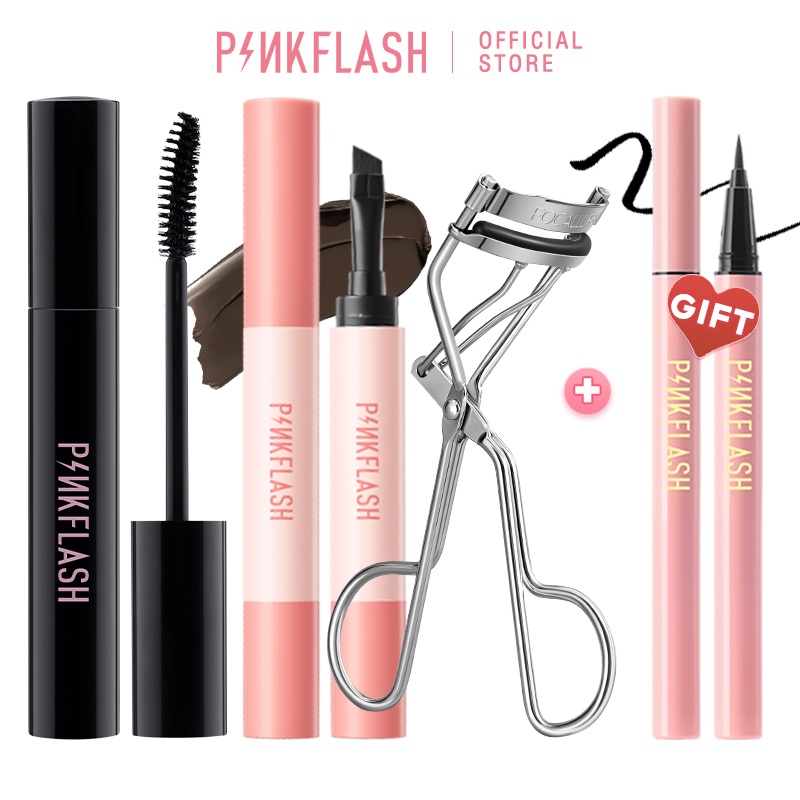 Pinkflash ที่เขียนคิ้ว กันน้ํา + อายไลเนอร์ เรียบ + มาสคาร่า สีดํา เม็ดสีสูง + ที่ดัดขนตา ติดทนนาน 4 ชิ้น ชุดตา