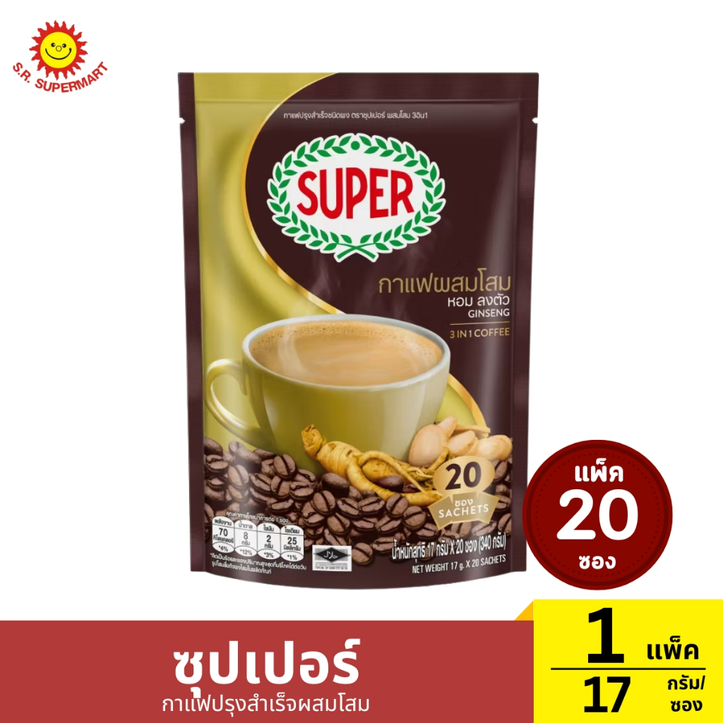 ซุปเปอร์ กาแฟปรุงสำเร็จผสมโสม แพ็ค 20 ซอง 1 แพ็ค / ปริมาณ 17 กรัม (1ซอง)