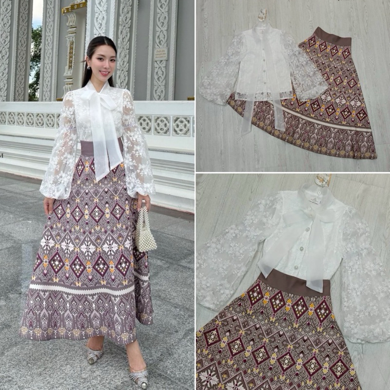 S-XXL ชุดเซทเสื้อลูกไม้สีขาว+กระโปรงพิมพ์ลายไทยโทนสีน้ำตาล ใส่ไปงานบุญ งานบวช งานแต่ง