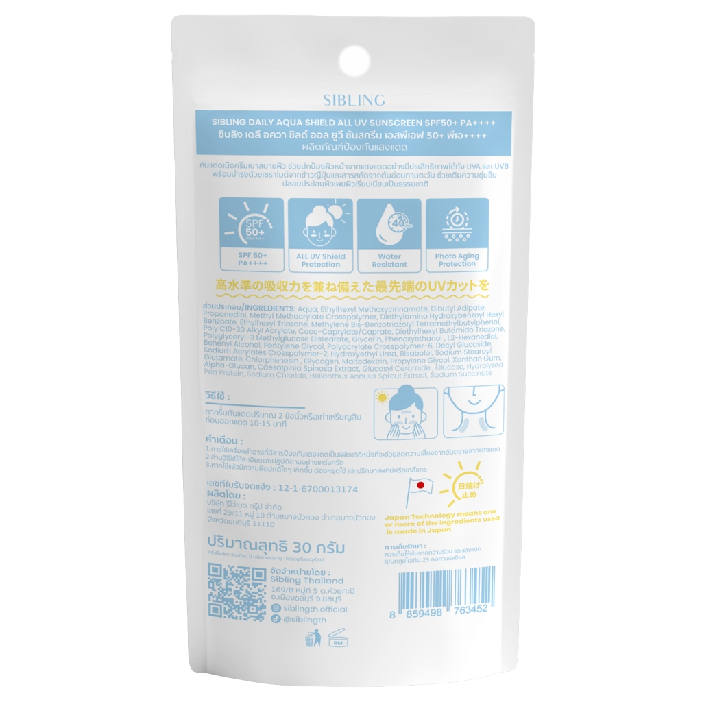 SIBLING - Daily Aqua Shield All UV Sunscreen SPF 50+ PA++++ (30g.) ซิบลิ้ง เดลี่ อควา ชิลด์ ออล ยูวี ซันสกรีน เอสพีเอฟ 5