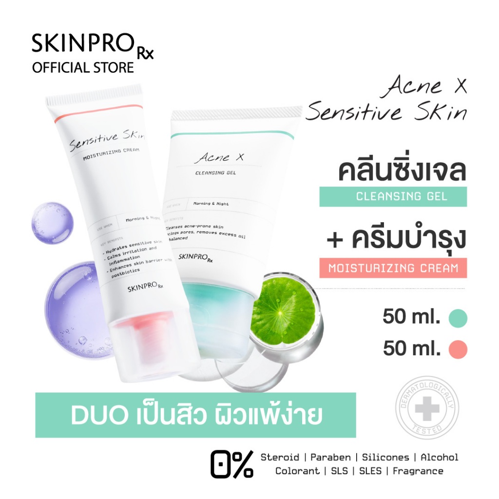 SKINPRO Rx DUO เป็นสิวผิวแพ้ง่าย - Acne X Cleansing Gel 50 ml. & Sensitive Skin Moisturizing Cream 50 ml.