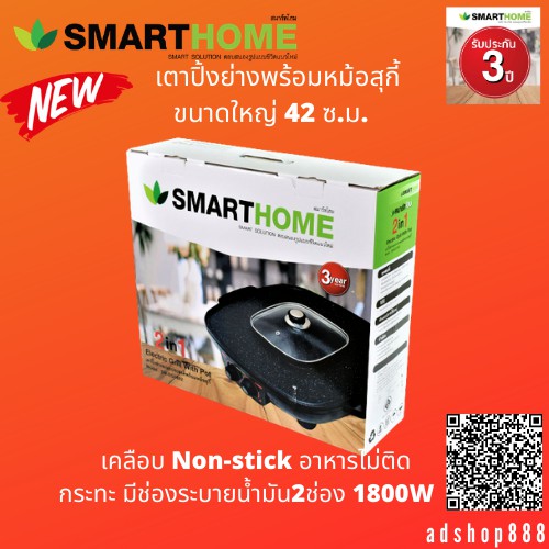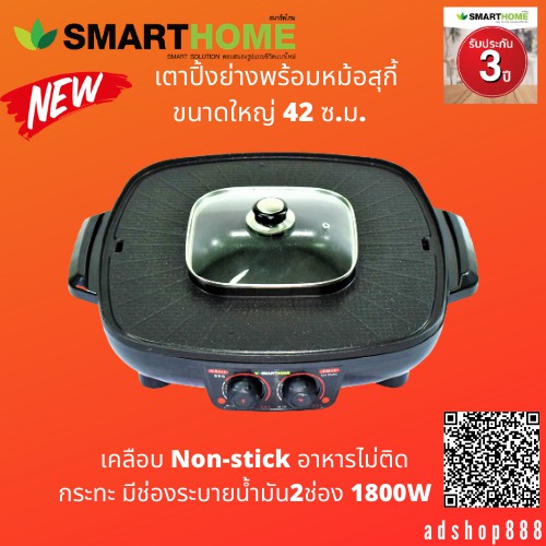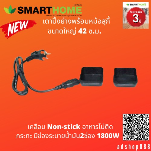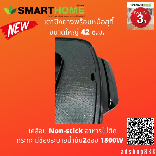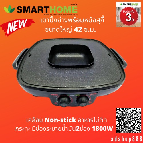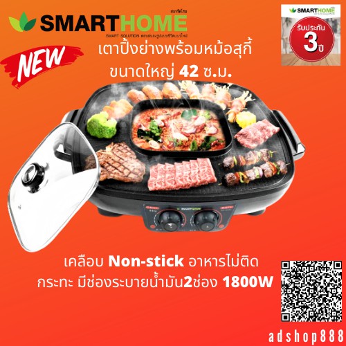 SMARTHOME เตาปิ้งย่าง หมูเตาปิ้งย่างพร้อมหม้อสุกี้1800W รุ่นEG1802 ประกัน3ปี