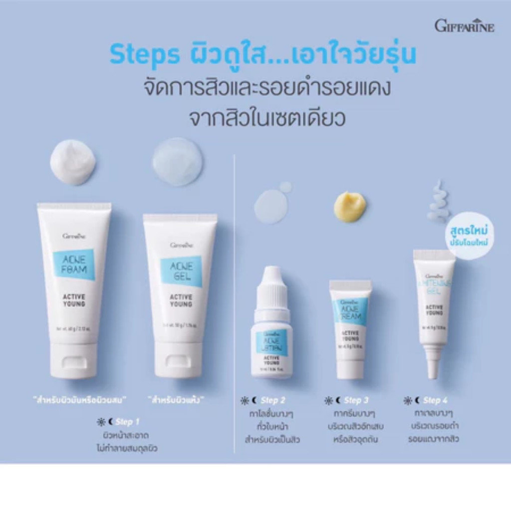 ผลิตภัณฑ์ดูแลผิวหน้า กิฟฟารีน แอคทีฟ ยัง Giffarine Active Young โฟมล้างหน้า เจลแต้มสิว ครีมลดรอยสิว