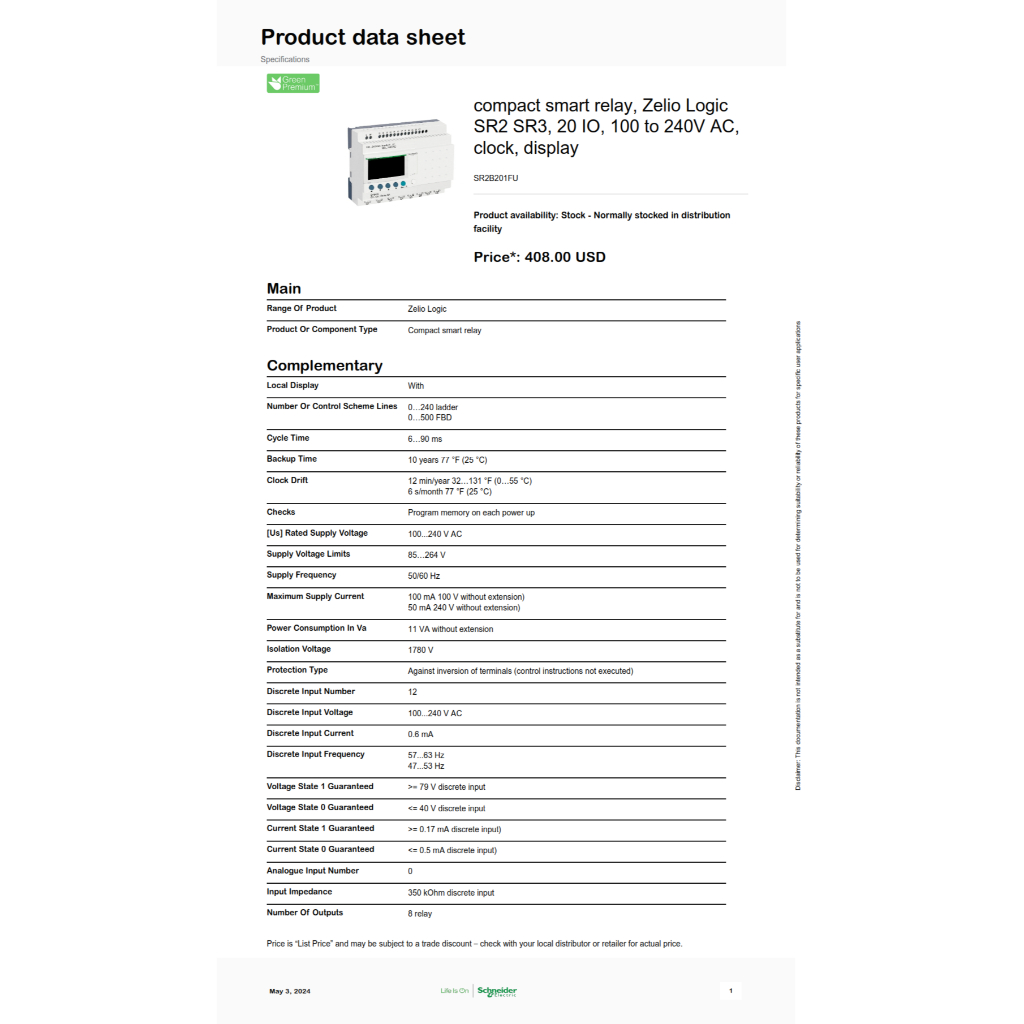 Schneider Smart Relay SR2B201FU 100-240VAC 20 I/O Compact Smart Relay Zelio Logic SR2 SR3 Clock - D