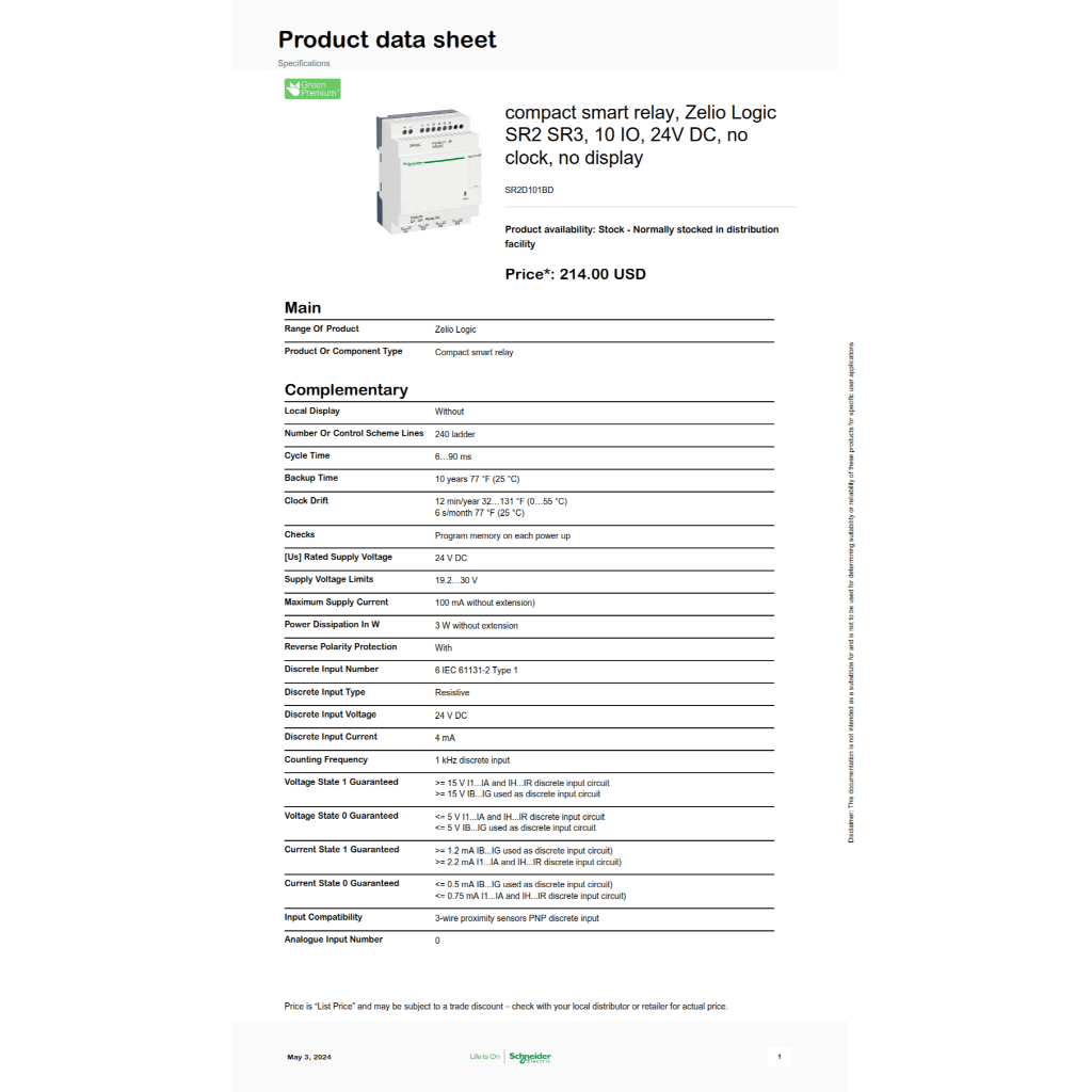 Schneider Smart Relay SR2D101BD 24VDC 10 I/O Compact Smart Relay Zelio Logic SR2 SR3 No Clock