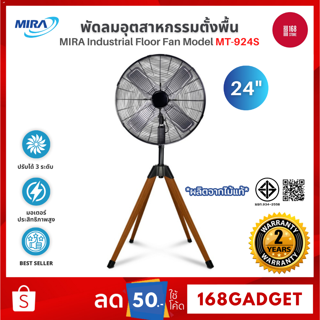 MIRA พัดลมอุตสาหกรรมตั้งพื้น รุ่น MT-924S Wood Legs 24 นิ้ว ดีไซน์ทันสมัย รับประกันมอเตอร์ 3 ปี