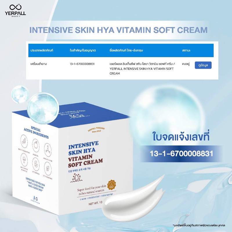 ครีมสกินไฮยา Yerpall Intensive Skin Hya Vitamin Soft Cream 10g. (กล่องฟ้า)