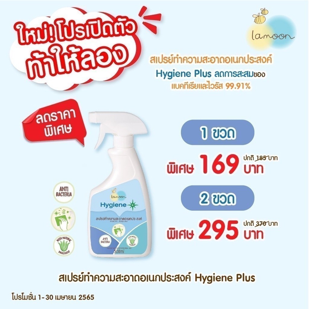 Lamoon ไฮจีนพลัส สเปรย์ฆ่าเชื้อไวรัส ทำความสะอาดอเนกประสงค์ ของเล่น ของใช้เด็ก และของใช้ในบ้าน สกัดจากธรรมชาติ 100%