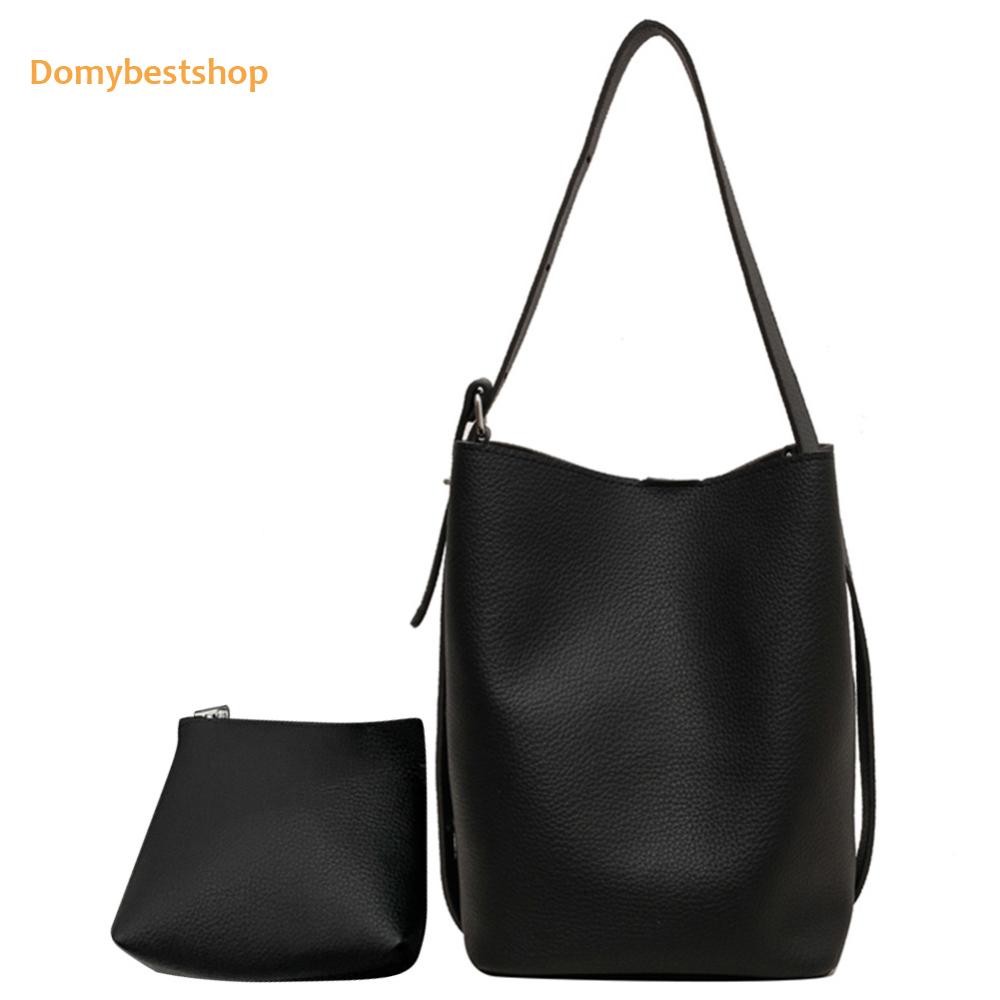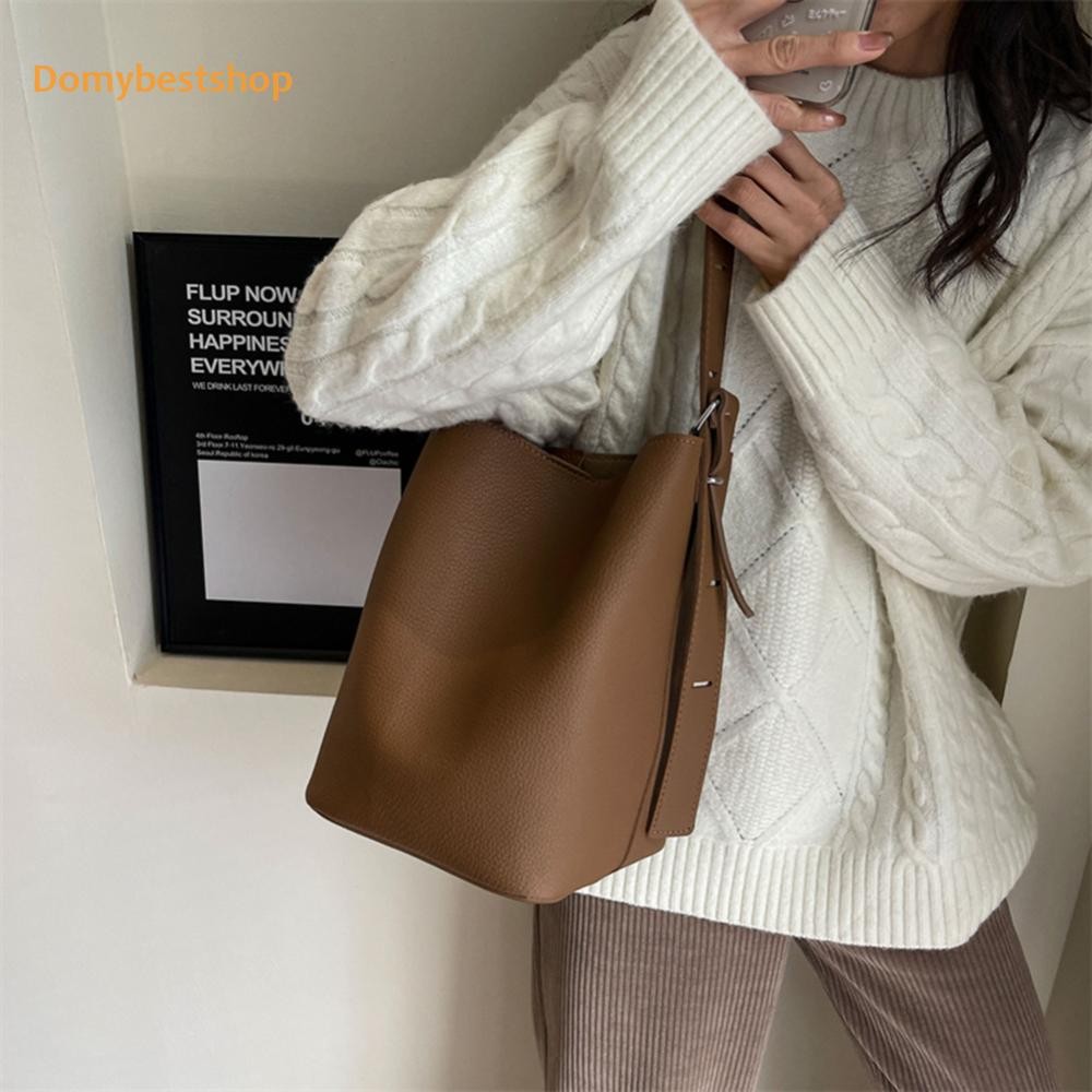 🚚 ผู้หญิงวินเทจถังกระเป๋าความจุขนาดใหญ่แฟชั่นกระเป๋าสะพายสายรัดปรับสีทึบกระเป๋าที่เรียบง่ายที่มีจับคู่คลัทช์ชุด[โดมีเบสช็อป.ไทย]
