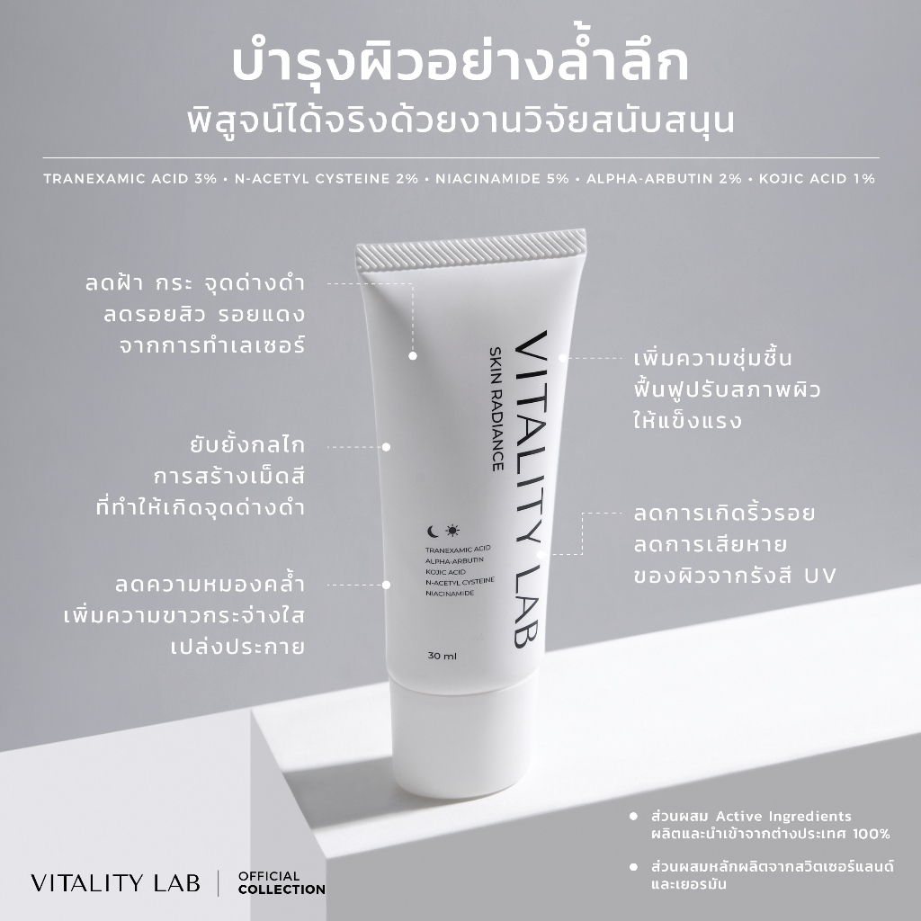 Skin Radiance: สกินเรเดียนซ์ สกินแคร์บำรุงผิวหน้าสำหรับผู้มีปัญหาหมองคล้ำ ฝ้า กระ จุดด่างดำ รอยสิว VITALITY LAB