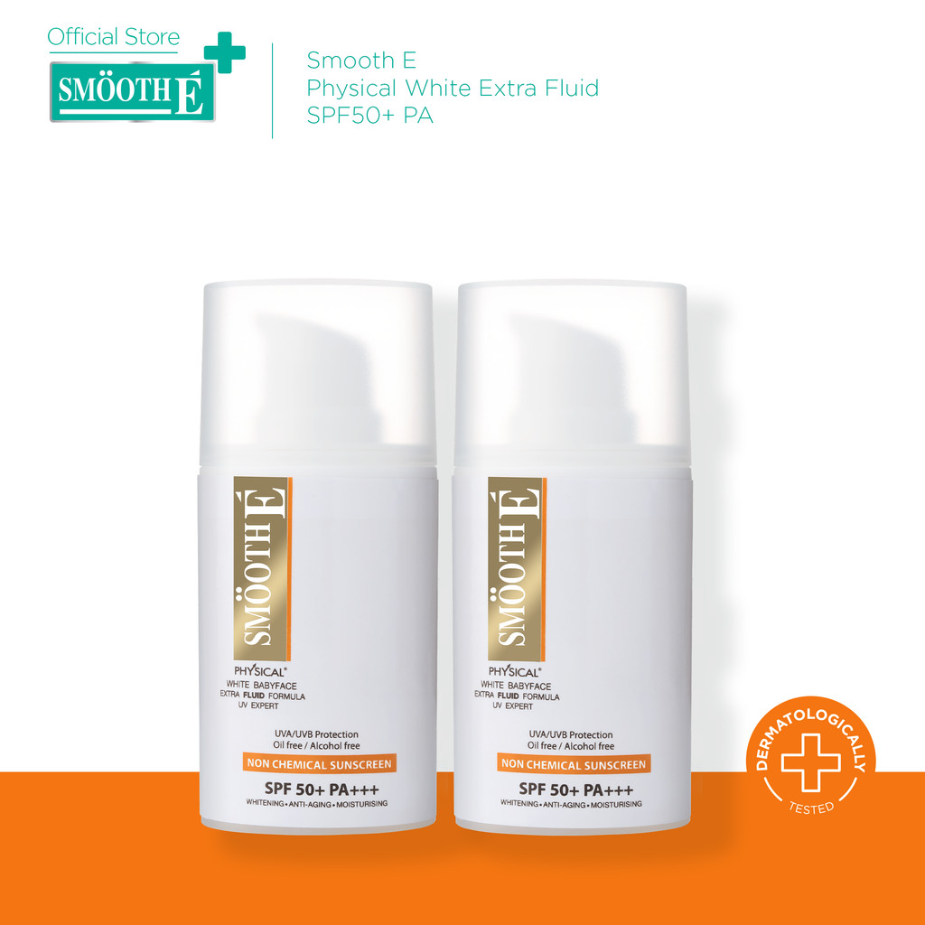 [แพ็ค 2] Smooth E Physical White Extra Fluid SPF50+ PA ครีมกันแดดเนื้อ Fluid สำหรับผิวมัน เป็นสิว ปกป้อง 8ชม.20G. สมูทอี