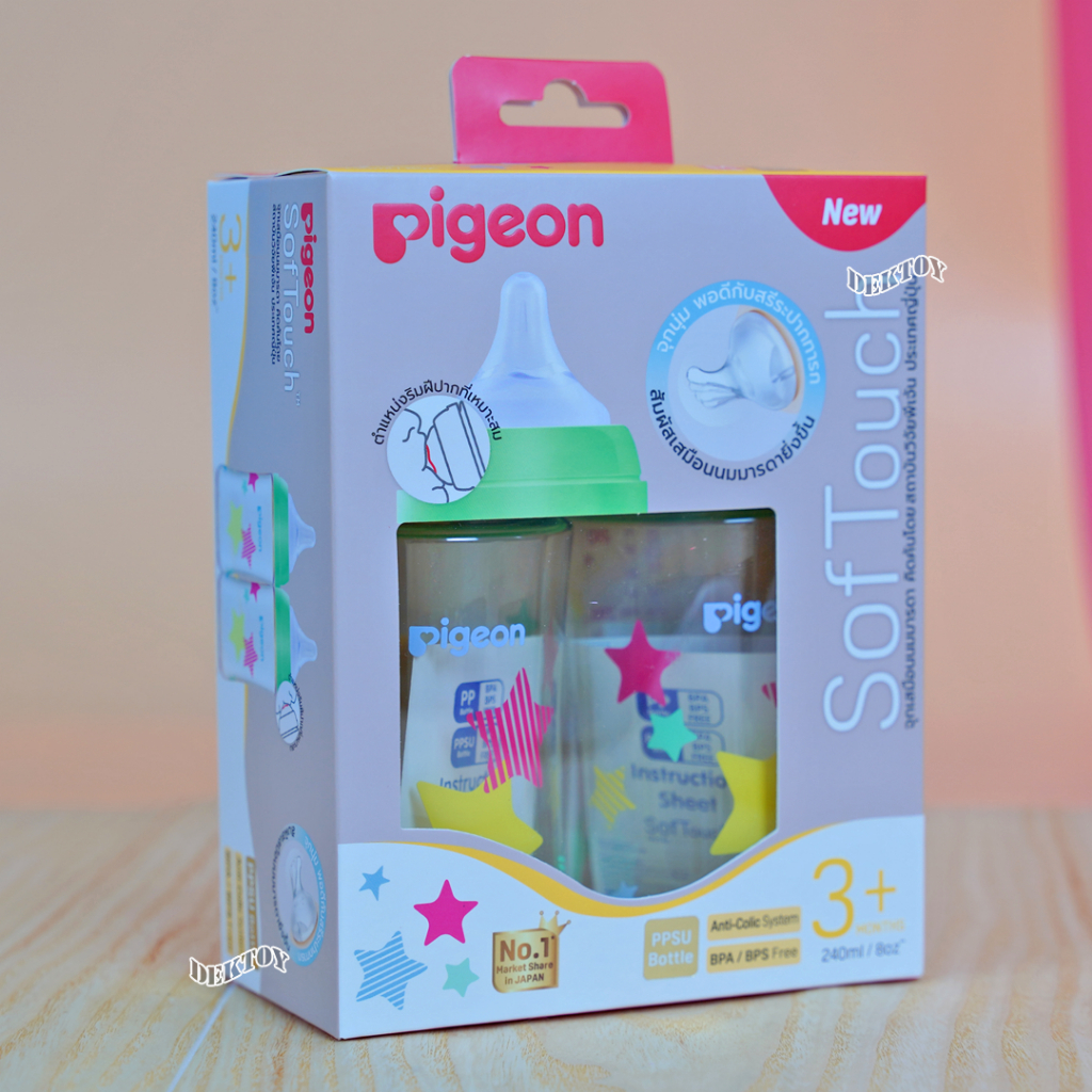 Pigeon พีเจ้น ขวดนมสีชา ลายดาว (รุ่นใหม่) 8 ออนซ์แพ็ค2ขวด+ จุกซอฟท์ทัช พลัส M