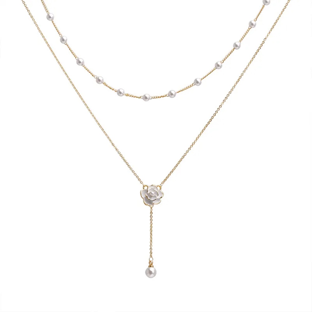 【YUE】สร้อยคอพู่สองชั้นมุกจี้ดอกไม้หรูหราเกาหลีละเอียดอ่อนโซ่ไหปลาร้าเครื่องประดับสำหรับผู้หญิง