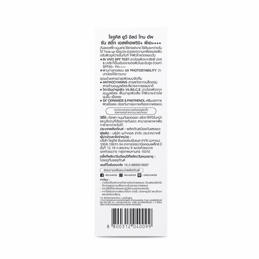 Rojukiss โรจูคิส ยูวี ชิลด์ โทน อัพ ซัน สติ๊ก เอสพีเอฟ50+ พีเอ++++ 15 กรัม