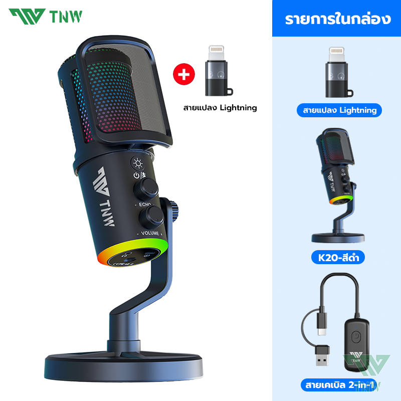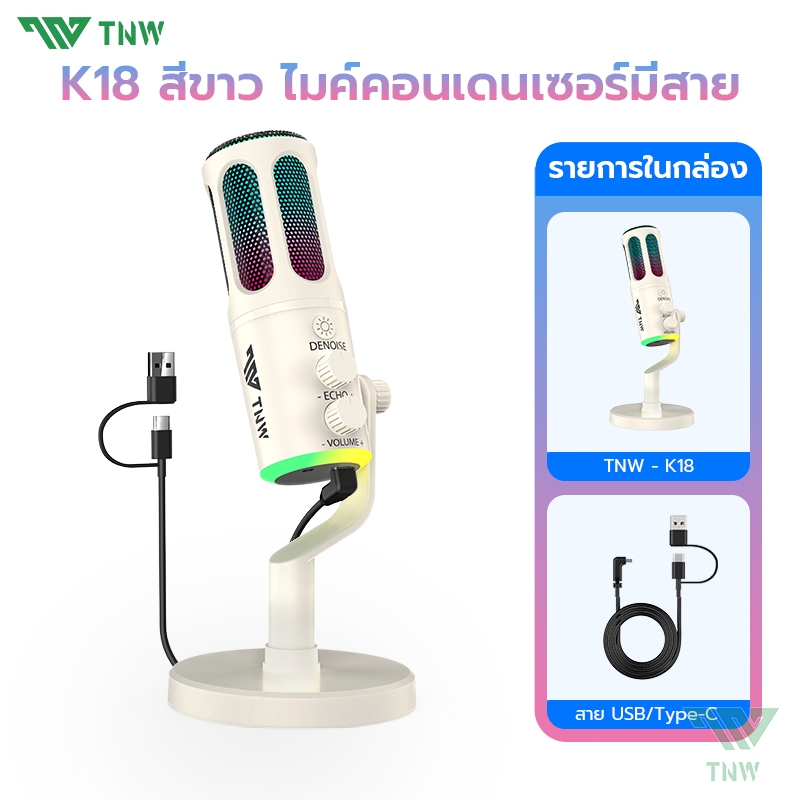 TNW K20 ไมโครโฟนไร้สาย Condenser Microphone AI ลดเสียงรบกวน ไมโครโฟนสําหรับเล่นเกม ไฟ RGB ไมค์สตรีมมิ่ง ไมค์เกมมิ่ง