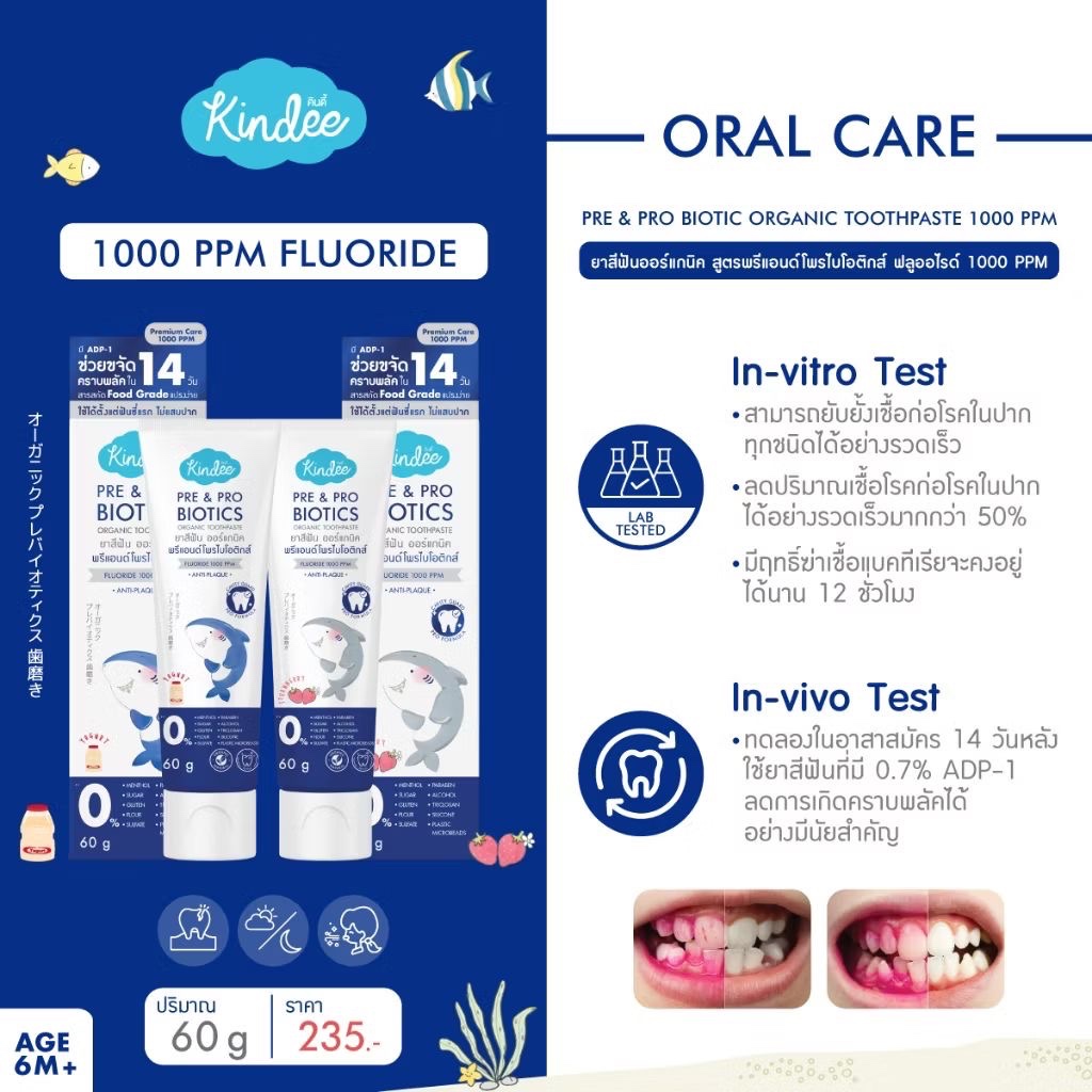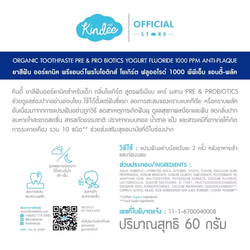 [ใหม่! ขนาดทดลอง] Kindee คินดี้ แปรงสีฟัน ยาสีฟันออร์แกนิค สูตรฟลูออไรด์ 1000 PPM โยเกิร์ต (5 กรัม)