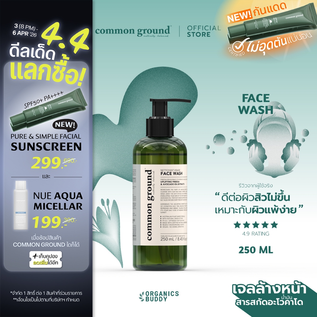 Common Ground Face Wash เจลล้างหน้า Avocado Oil Extracts อ่อนโยนพิเศษ ลดการเกิดสิว ลดการอุดตัน 250ml