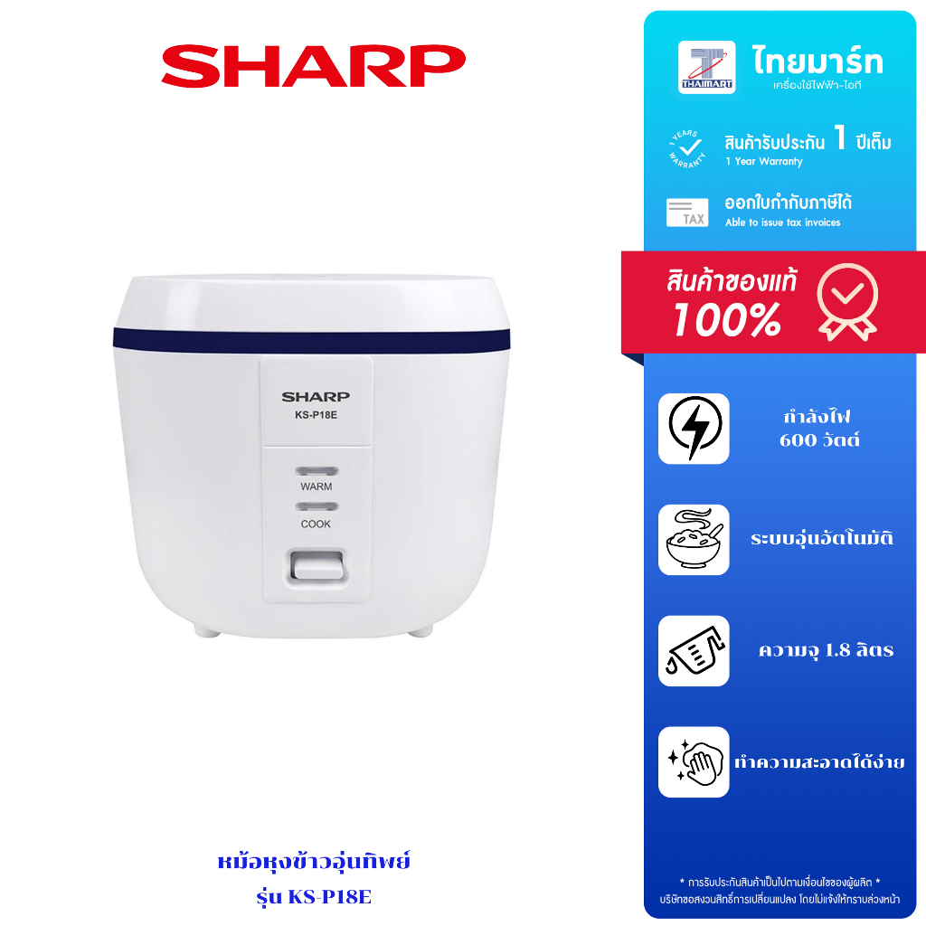 SHARP หม้อหุงข้าวอุ่นทิพย์ รุ่น KS-P18E ขนาด 1.8 ล. สีขาว รับประกันตัวหม้อ 1 ปี, รับประกันแผ่นความร้อน 3 ปี
