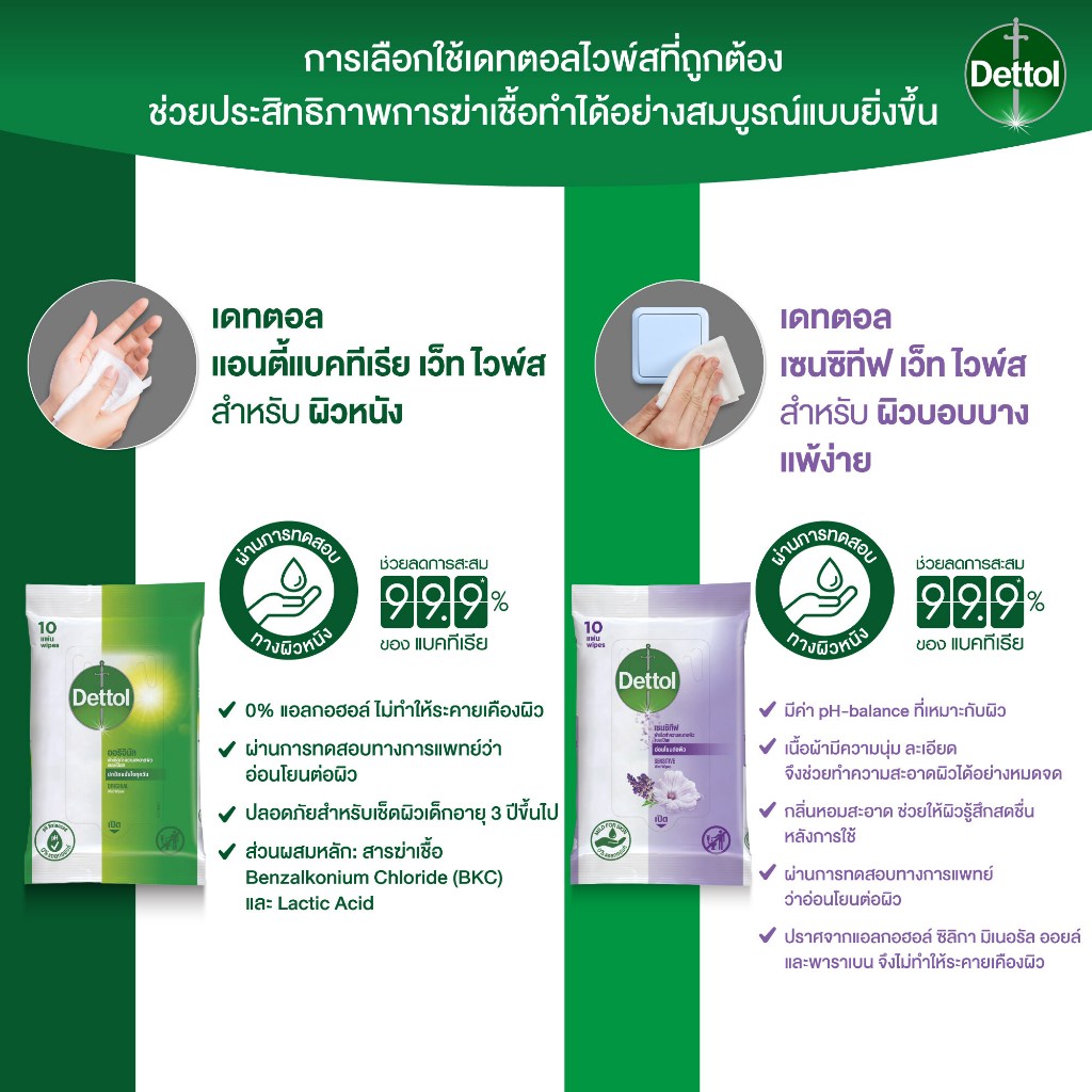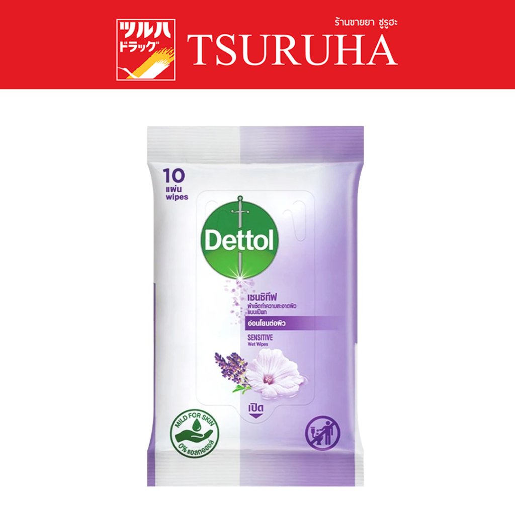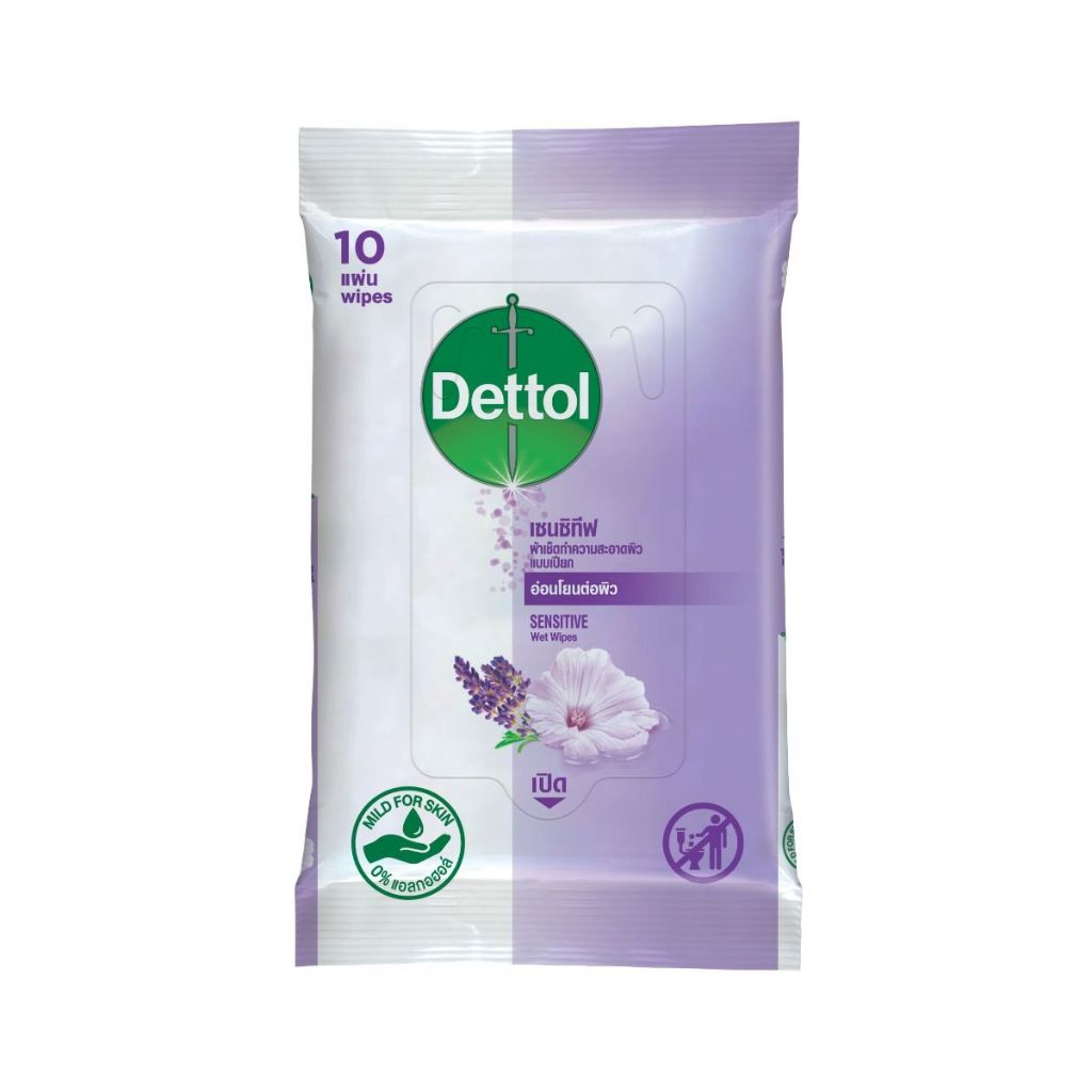 เดทตอล ผ้าเช็ดทำความสะอาดผิวแบบเปียก สูตรเซนซิทีฟ จำนวน 10 แผ่น / Dettol Sensitive Wet Wipes 10 Sheets