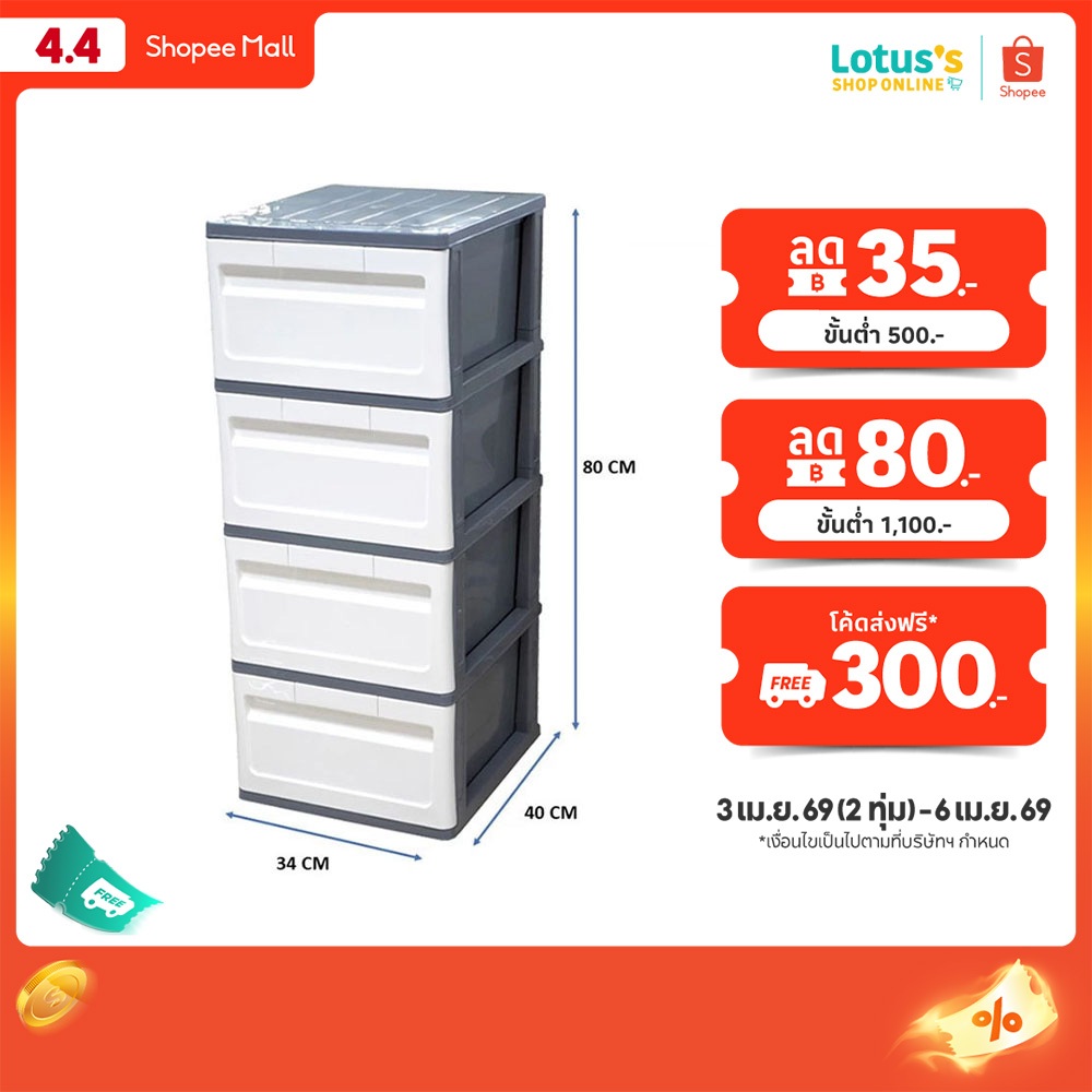 โลตัส ตู้ลิ้นชัก MINI DIY สีเทาขาว 4 ชั้น ขนาด 34x40x80 ซม. LOTUSS DRAWER MINI DIY GRAY-WHITE 4TIERS 34X40X80 CM.