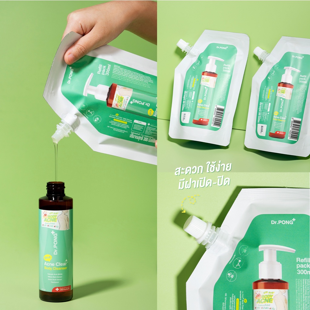 Refill pack 300 ml - ลดสิวที่ตัว Dr.PONG BHA ACNE CLEAR BODY CLEANSER เจลอาบน้ำลดสิว 1% BHA Salicylic acid