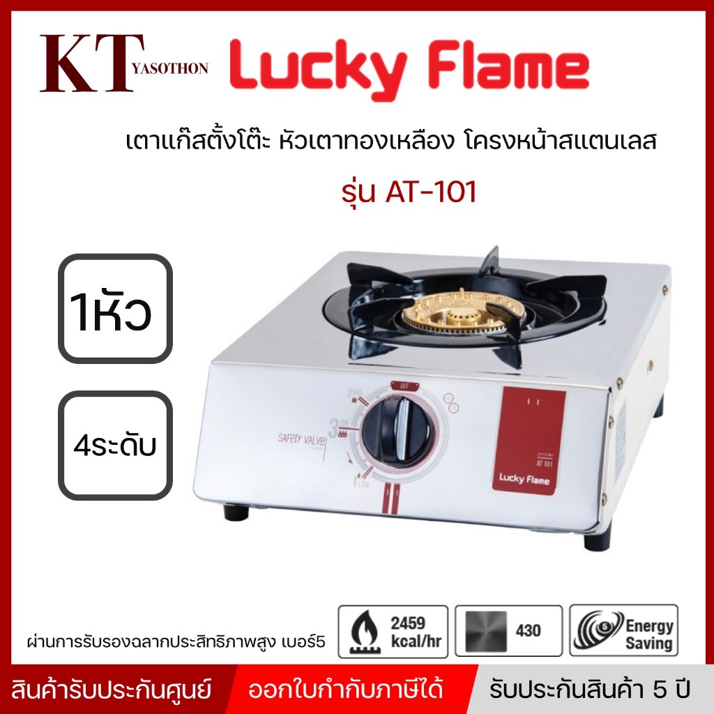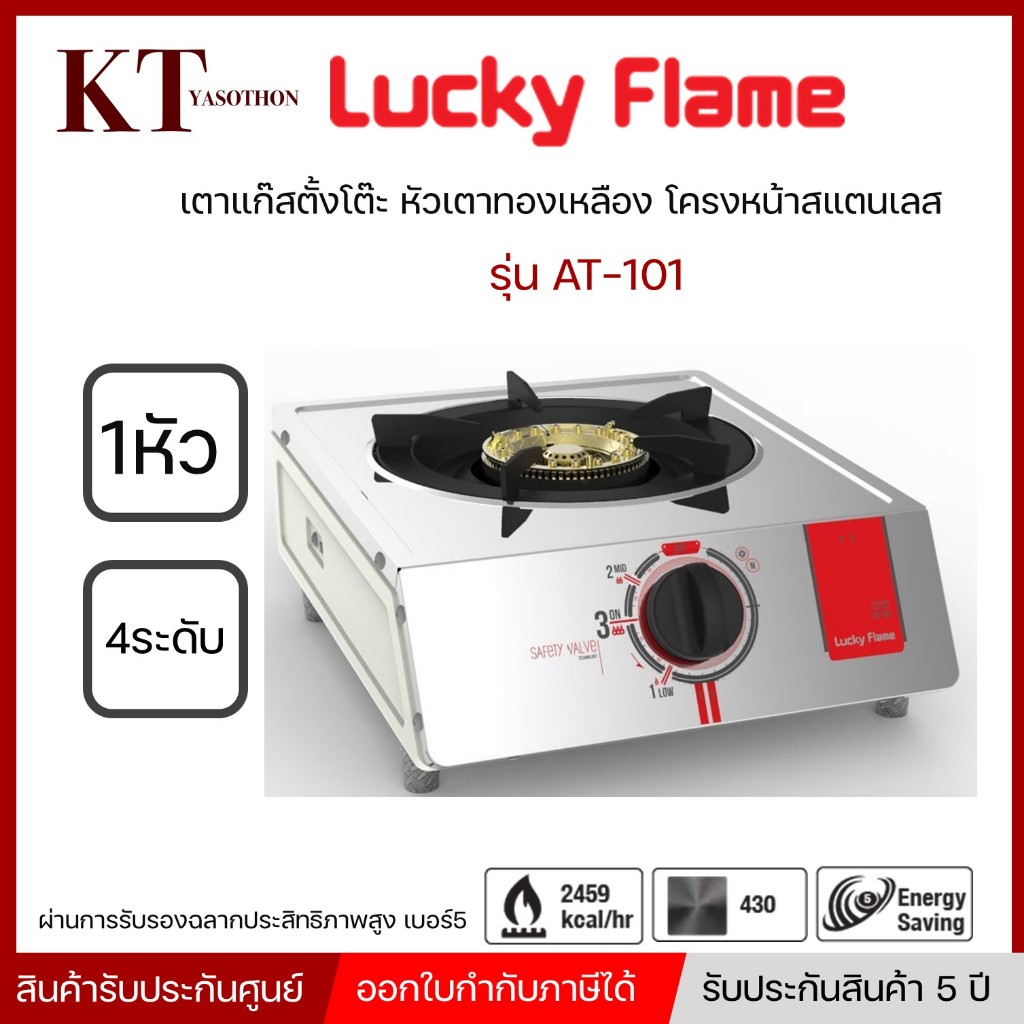 Lucky Flame เตาแก๊ส รุ่น AT-101 หัวเดี่ยวตั้งโต๊ะ หัวเตาทองเหลือง โครงหน้าสแตนเลส ด้านข้างสีครีม