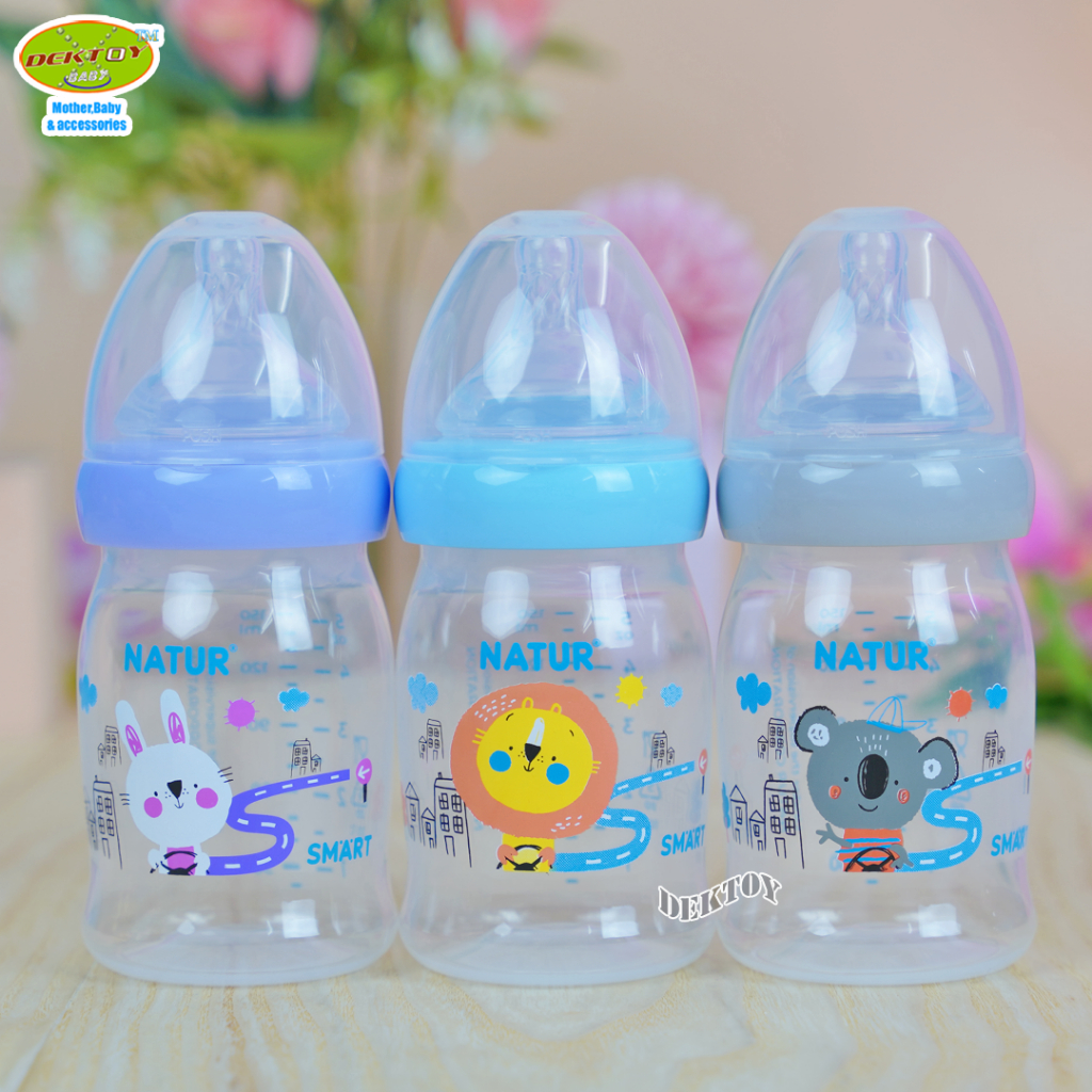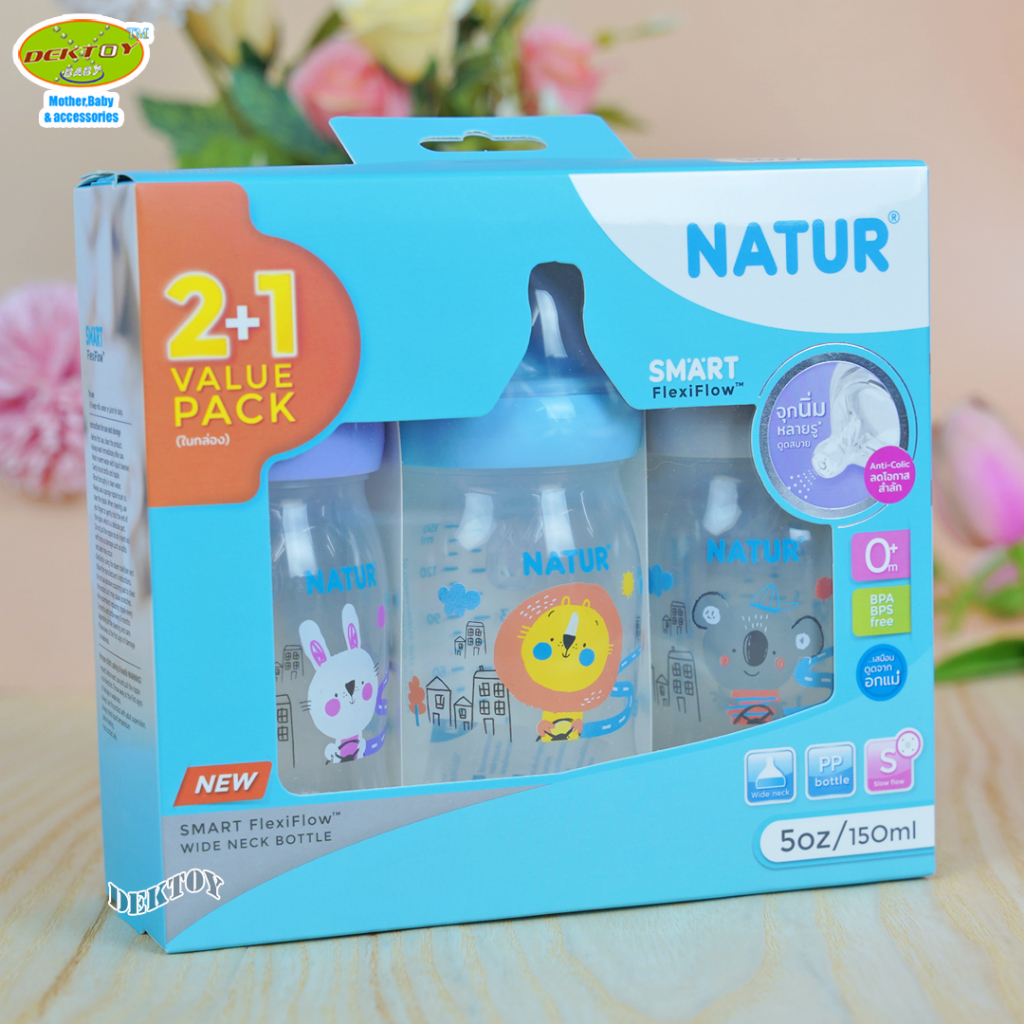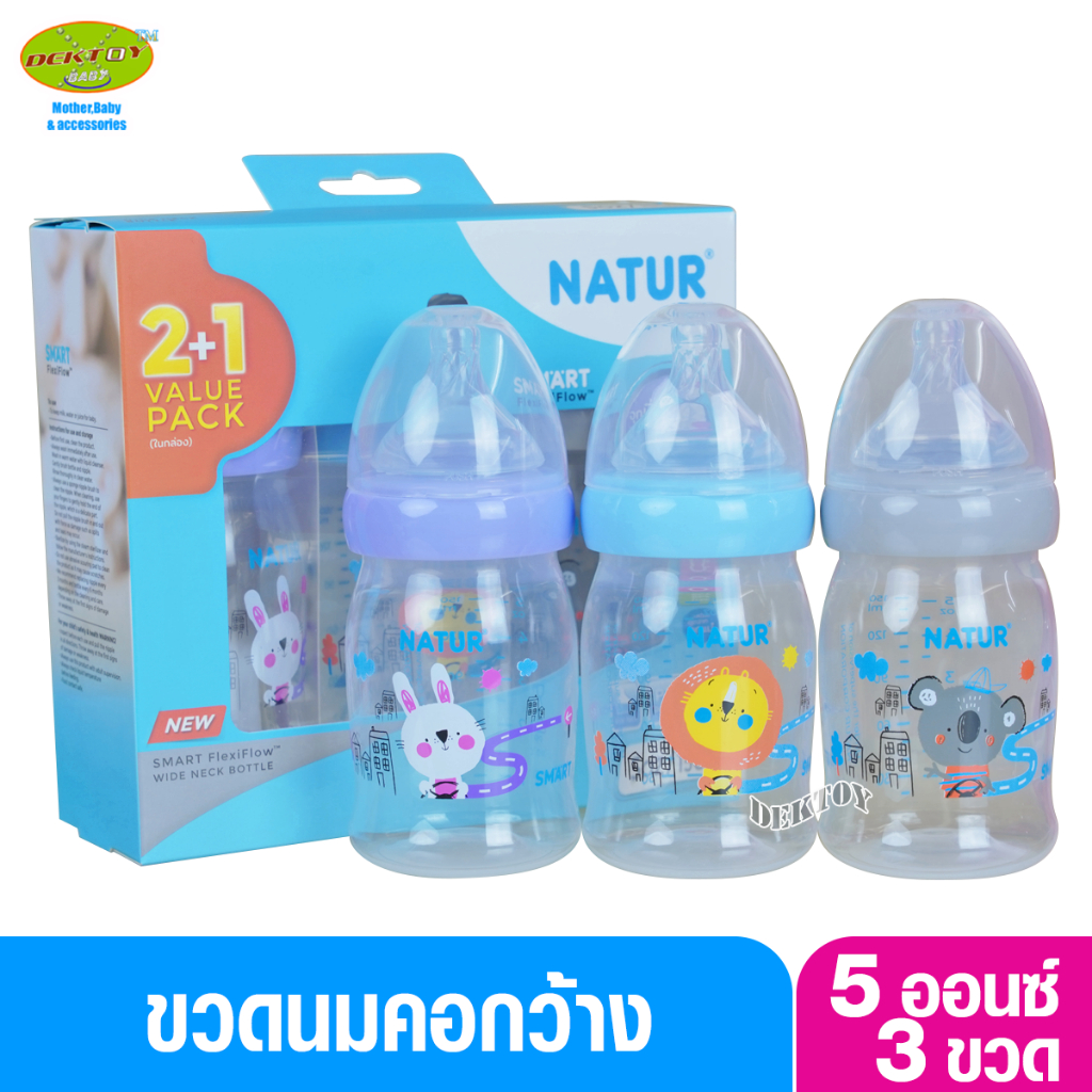 Natur เนเจอร์ ขวดนมคอกว้างสมาร์ท จุกนิ่มหลายรู PP 5oz ดูดสบาย เเพ็ก 2 ฟรี 1 Smart FlexiFlow 84217