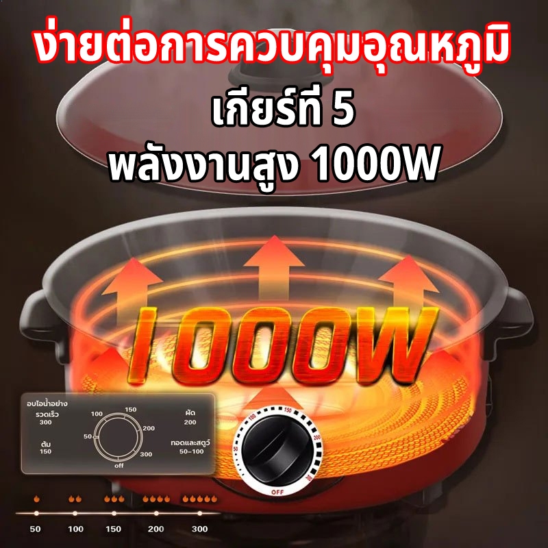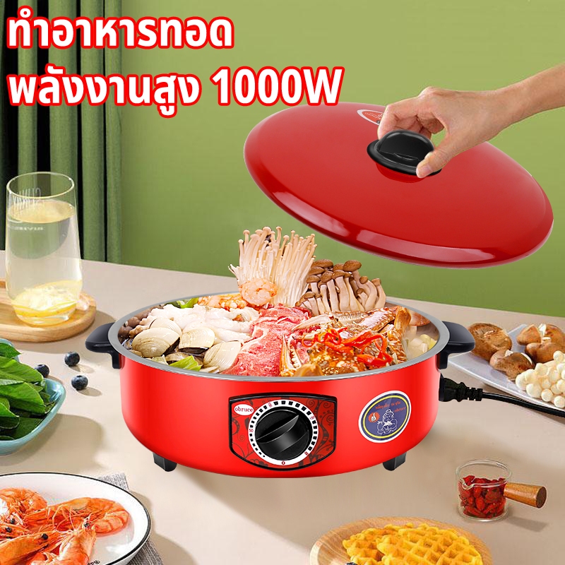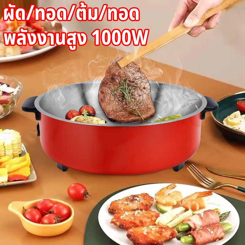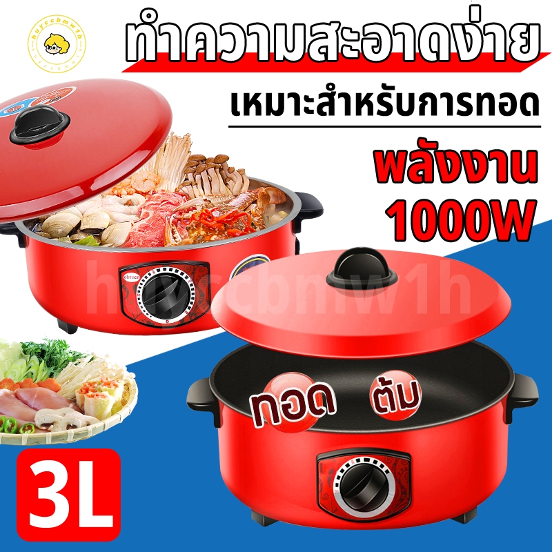 หม้อไฟฟ้า 3in1 3L + หม้อหุงข้าว - กาต้มน้ำไฟฟ้า สีแดง 1000W หุง-ตุ๋น-ทอด เหมาะสำหรับครอบครัว 2-8 คน เคลือบสีกันสนิม