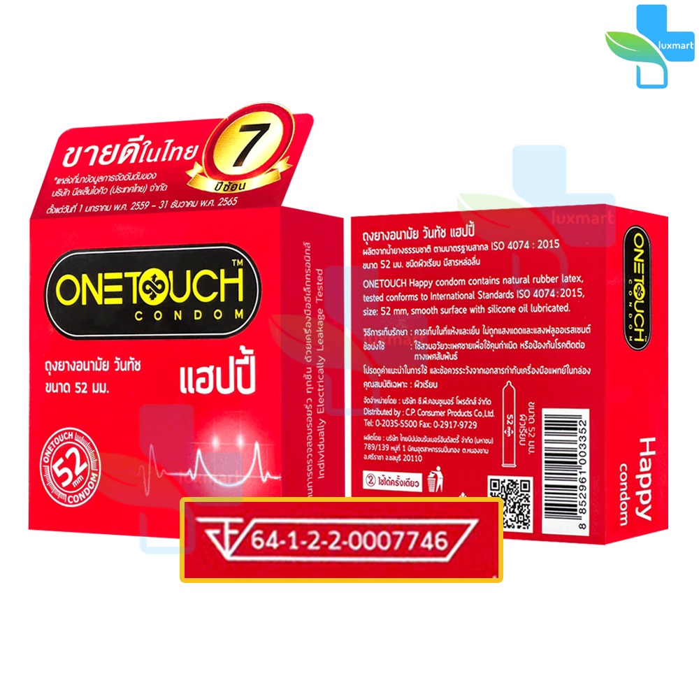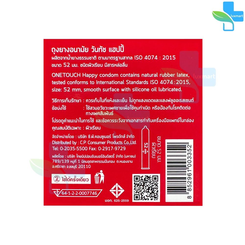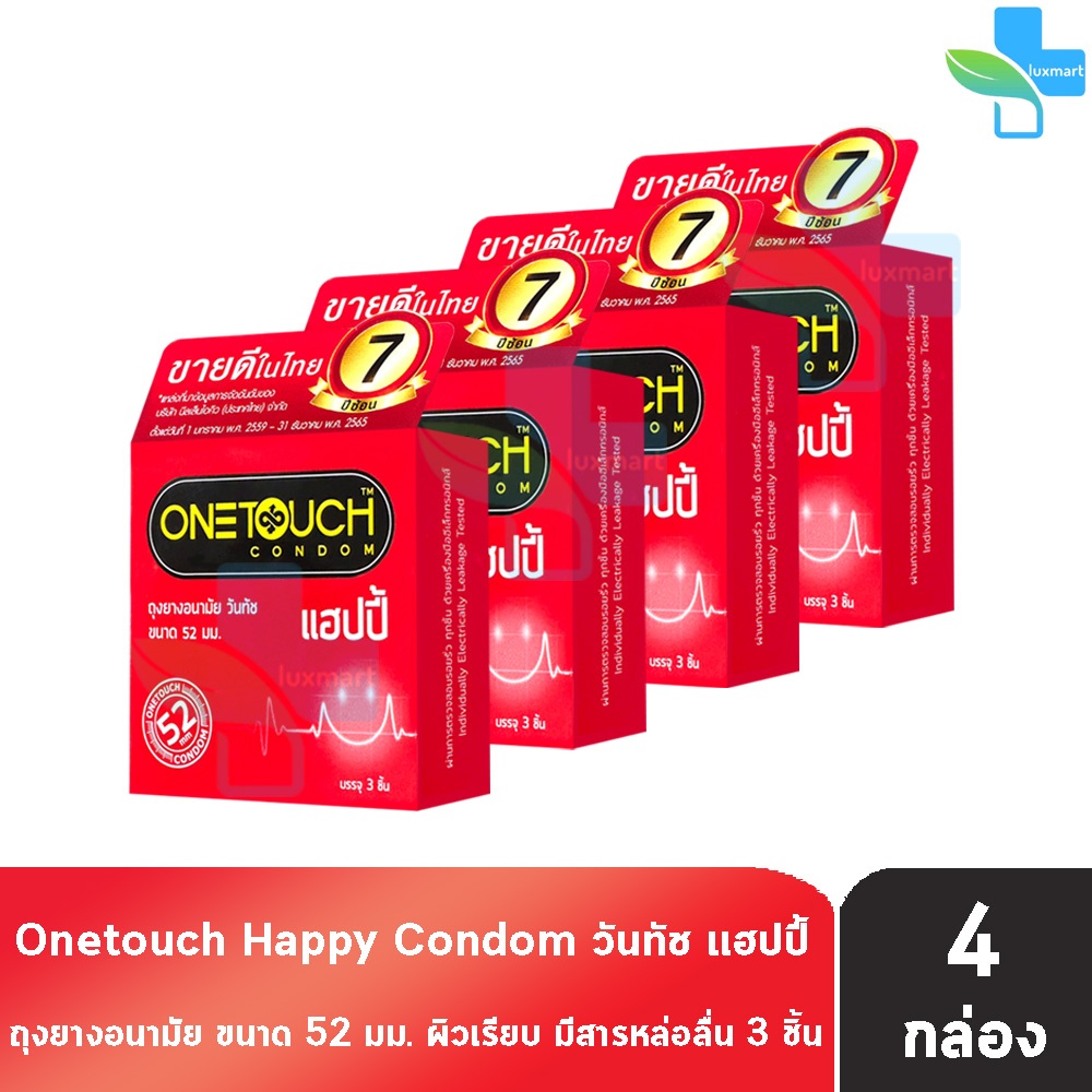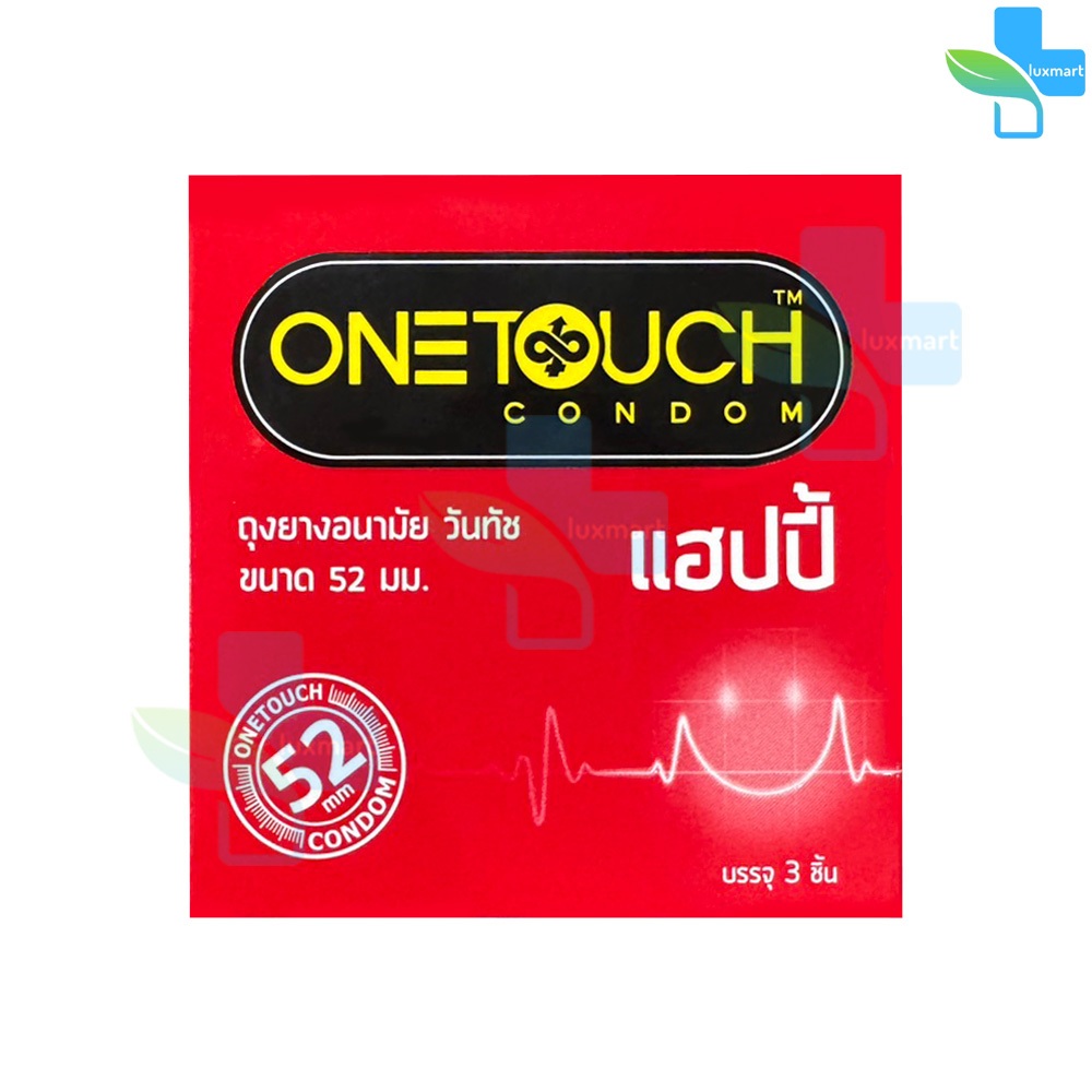 Onetouch Happy ถุงยาง วันทัช แฮปปี้ ขนาด 52 มม. บรรจุ 3 ชิ้น [4 กล่อง] JJ 5305 ถุงยางอนามัย ผิวเรียบ มีสารหล่อลื่น