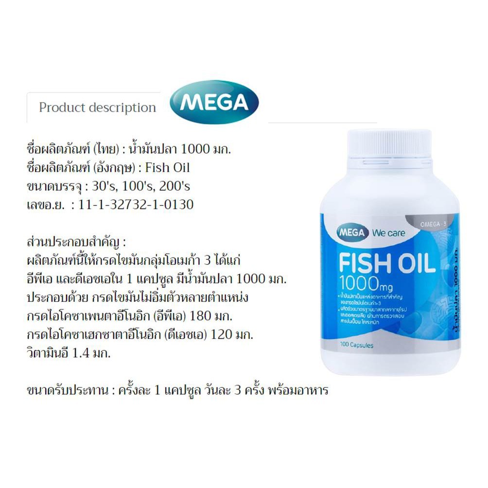 Mega We Care Fish Oil 1000mg. 100'S /200'S น้ำมันปลา เมก้า วีแคร์ 1000มก. 100แคปซูล /200แคปซูล