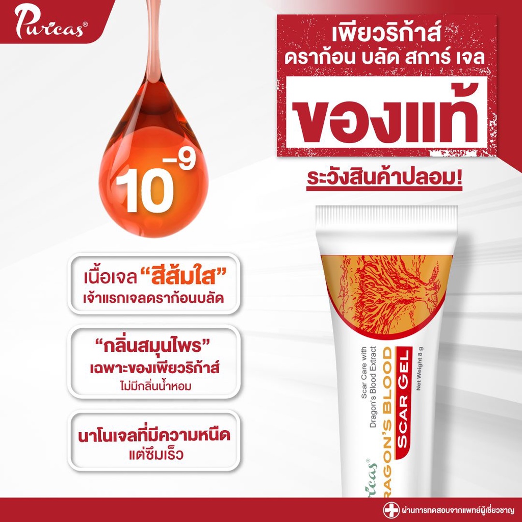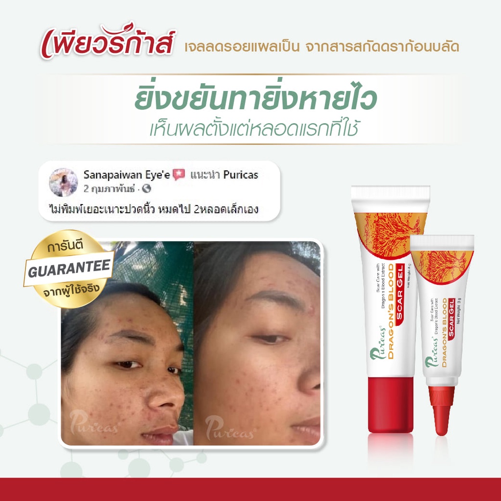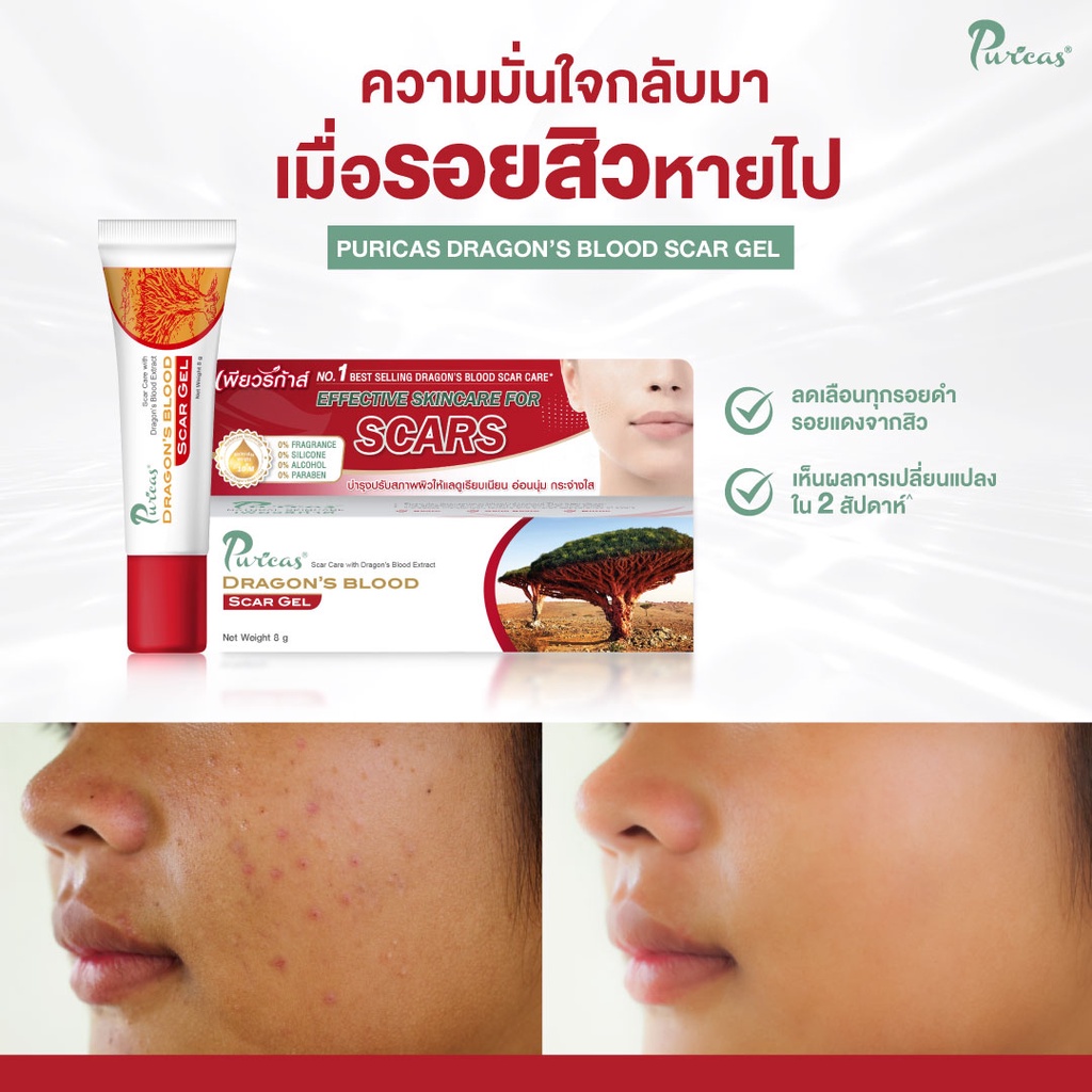 แพ็คคู่ Puricas Dragon's Blood Scar Gel ขนาด 20 กรัม ฟรี เจลลดรอยสิว ขนาด 3กร ัม