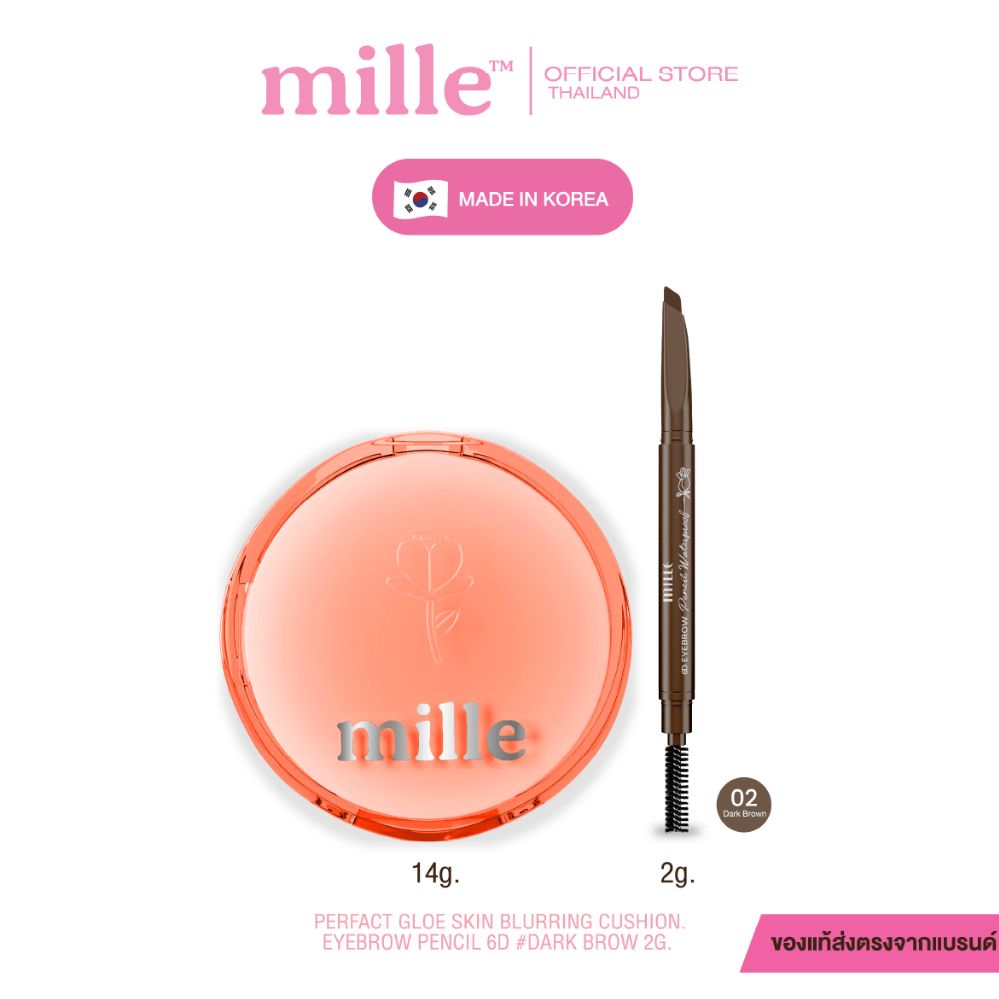 [1แถม1] Mille คุชชั่นโกลว์ Perfect Glow Skin Cover Blurring Cushion SPF50+ PA+++ และดินสอเขียนคิ้วปลายตั ด 6D Dark Brown