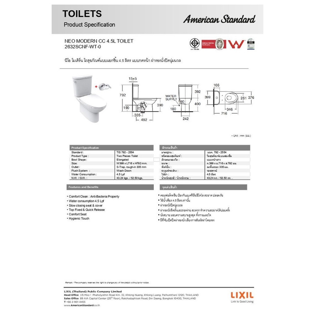 American Standard สุขภัณฑ์สองชิ้น แบบกดหน้า 4.5 ลิตร รุ่น นีโอโมเดิร์น 2632SCNF-WT-0 ขนาด สีขาว