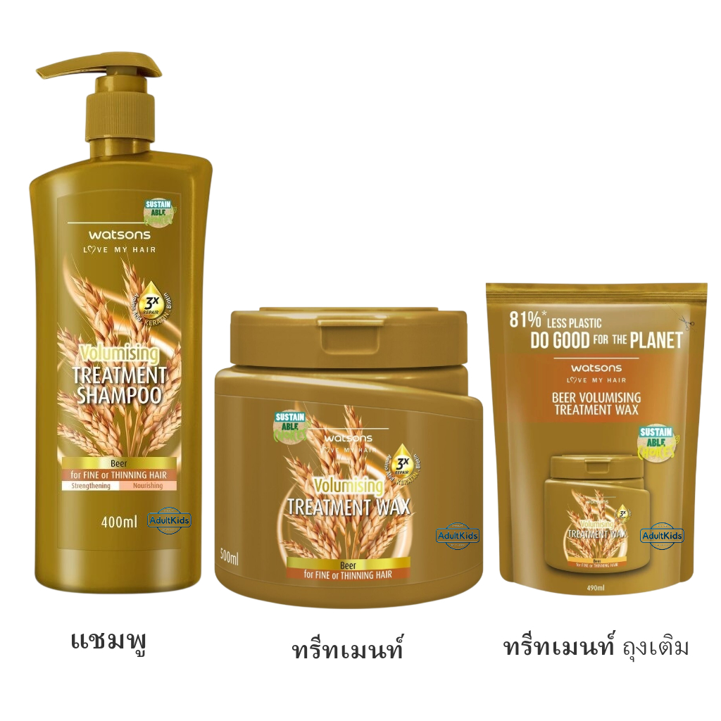 ลดเพิ่ม 30% 🔥 Watsons วัตสัน ทรีทเมนท์ แชมพู เบียร์ ฟอร์ ฟายน์ ออร์ ทินนิ่ง 400 มล ถุงเติม 490 มล กระปุก 500 มล